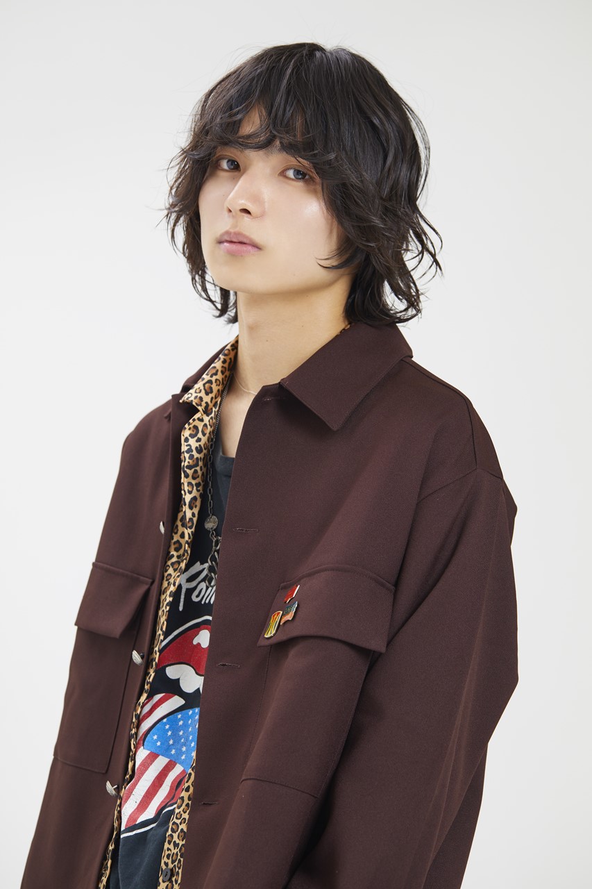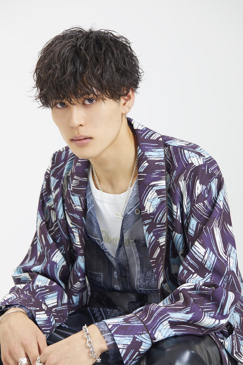 カット/マッシュベース。サイドとバックは刈上げてツーブロックに。顔まわりと前髪はレイヤーを入れて毛先が散るようにカット。カラー/なし。パーマ/刈上げのすぐ上はスパイラル、さらにその上は波巻きスパイラル、そしてトップはツイストスパイラル巻きで、顔まわりに無造作な動きを出す。