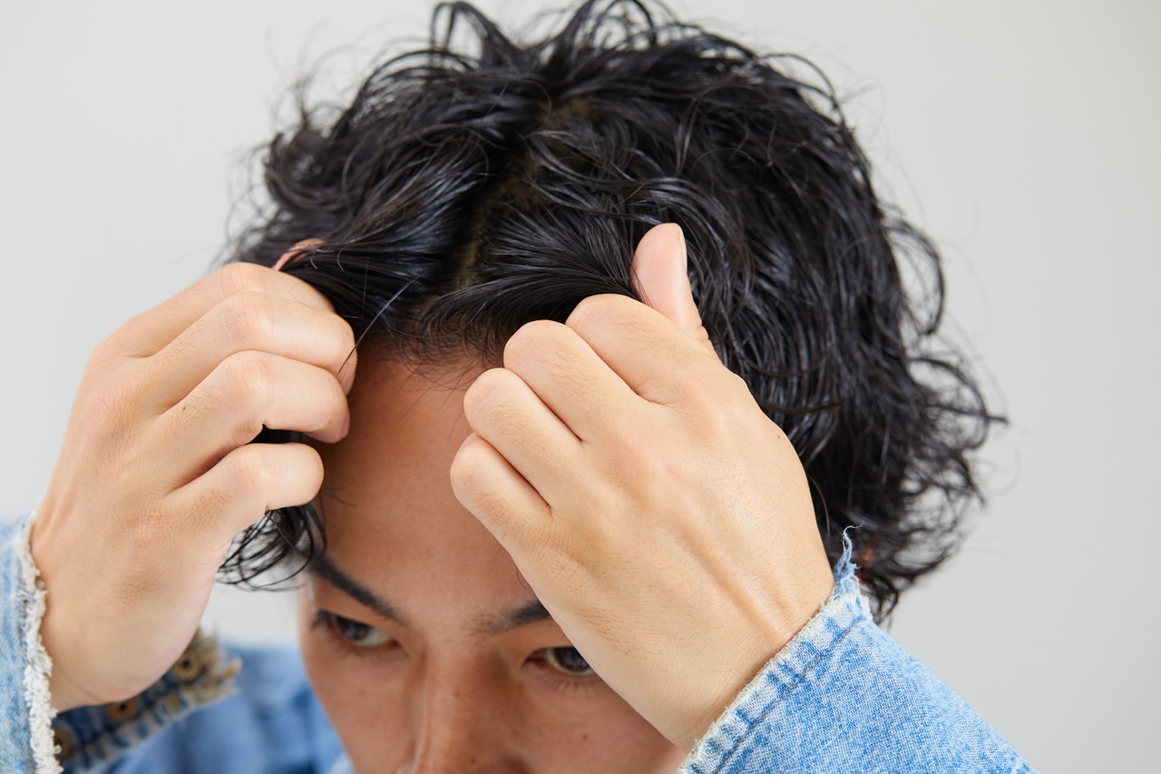 ドライ後、フォームを塗布し、ウェット状態にしてからバームをもみ込む。しっかりもみ込むことで、細かい束ができてパーマが際立つ。