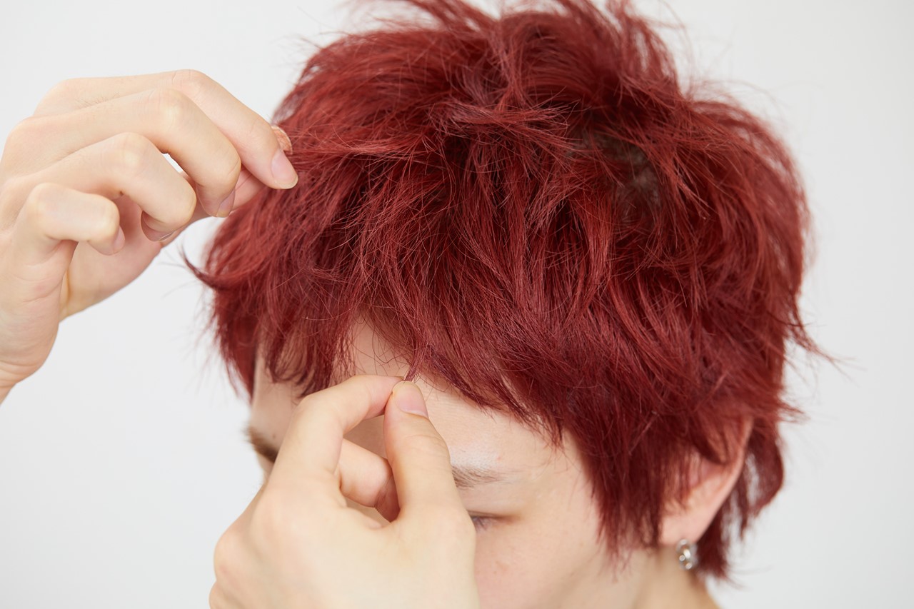 長めに残した毛をアイロンで動きをつけて立ち上げたら、ハードワックスを塗布。立ち上げた毛先をコームでさらに立ち上げて整える。