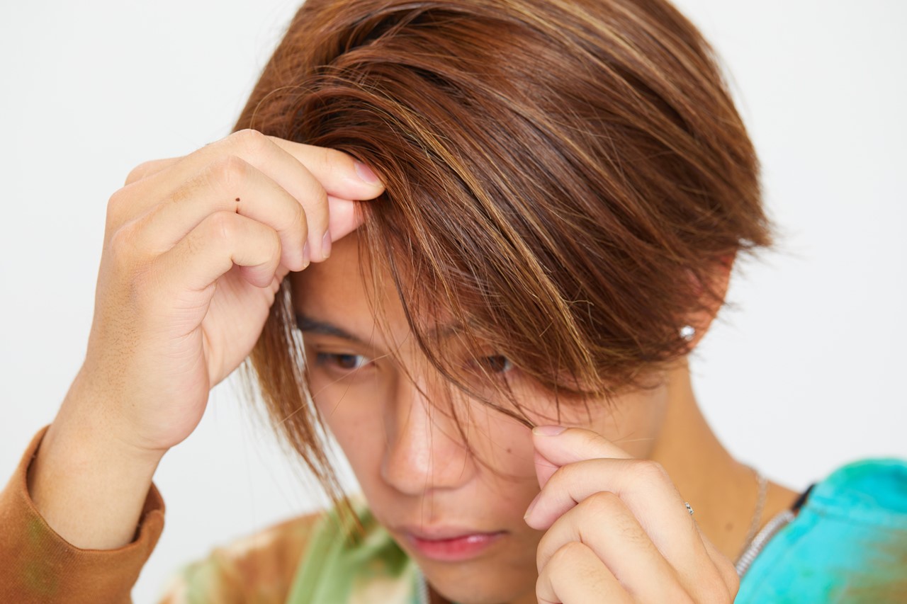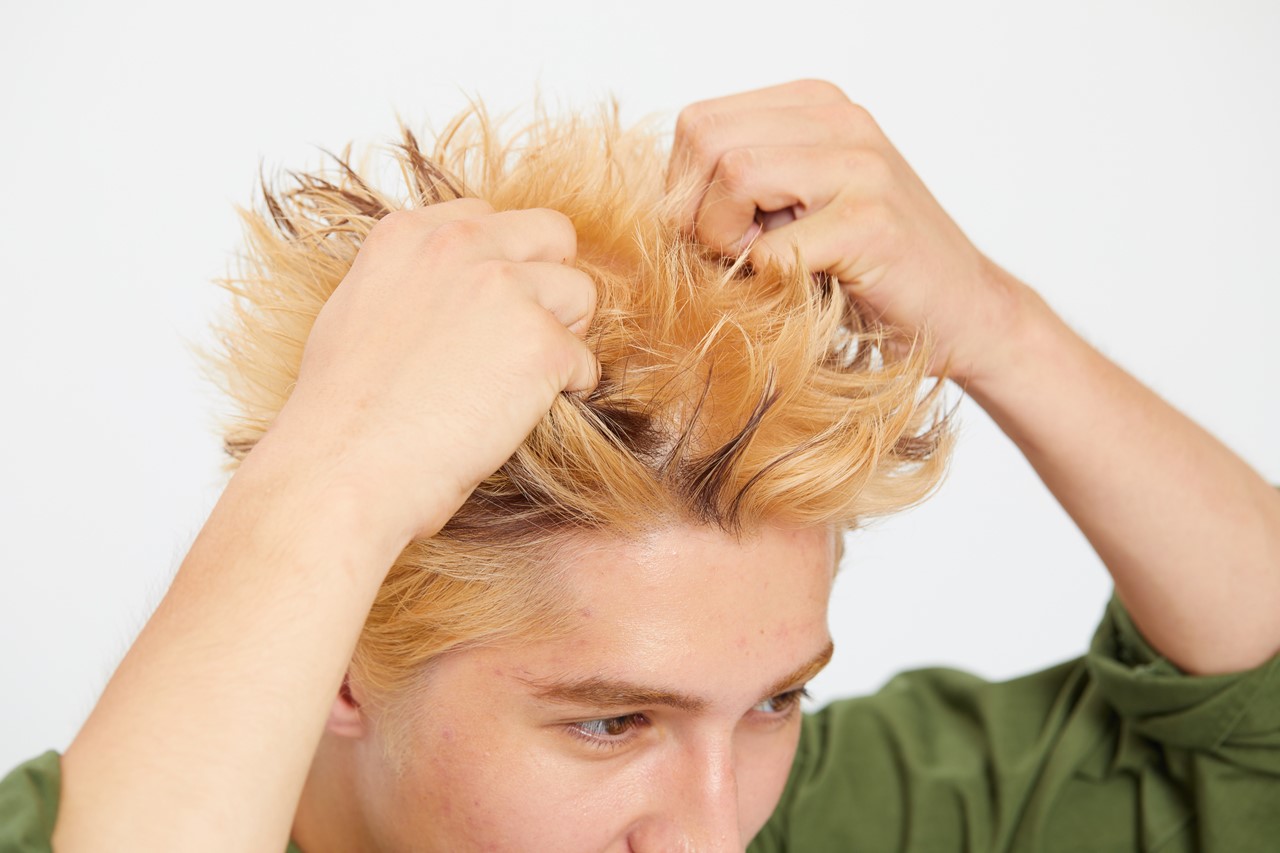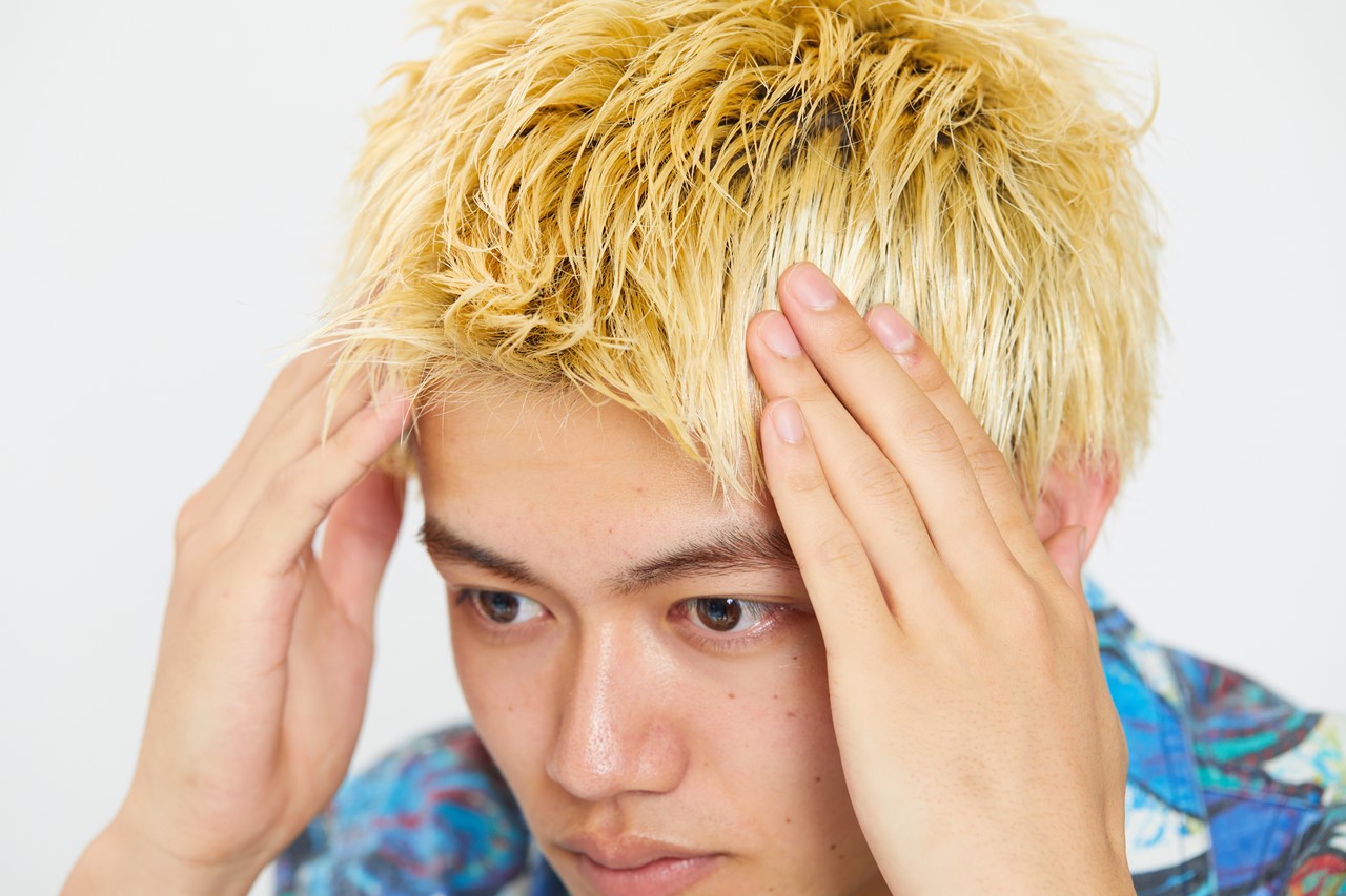 カット/ショートレイヤーベース。サイドはタイトに収まる長さにカット。トップも長めに設定し、角を残す。カラー/ブリーチ(1回)後、あえて黄色みを残したブロンドに、6トーンのブラウンをポイントでオン。ロックバンド「Sum 41」のデリック・ウィブリーをオマージュ。パーマ/なし。