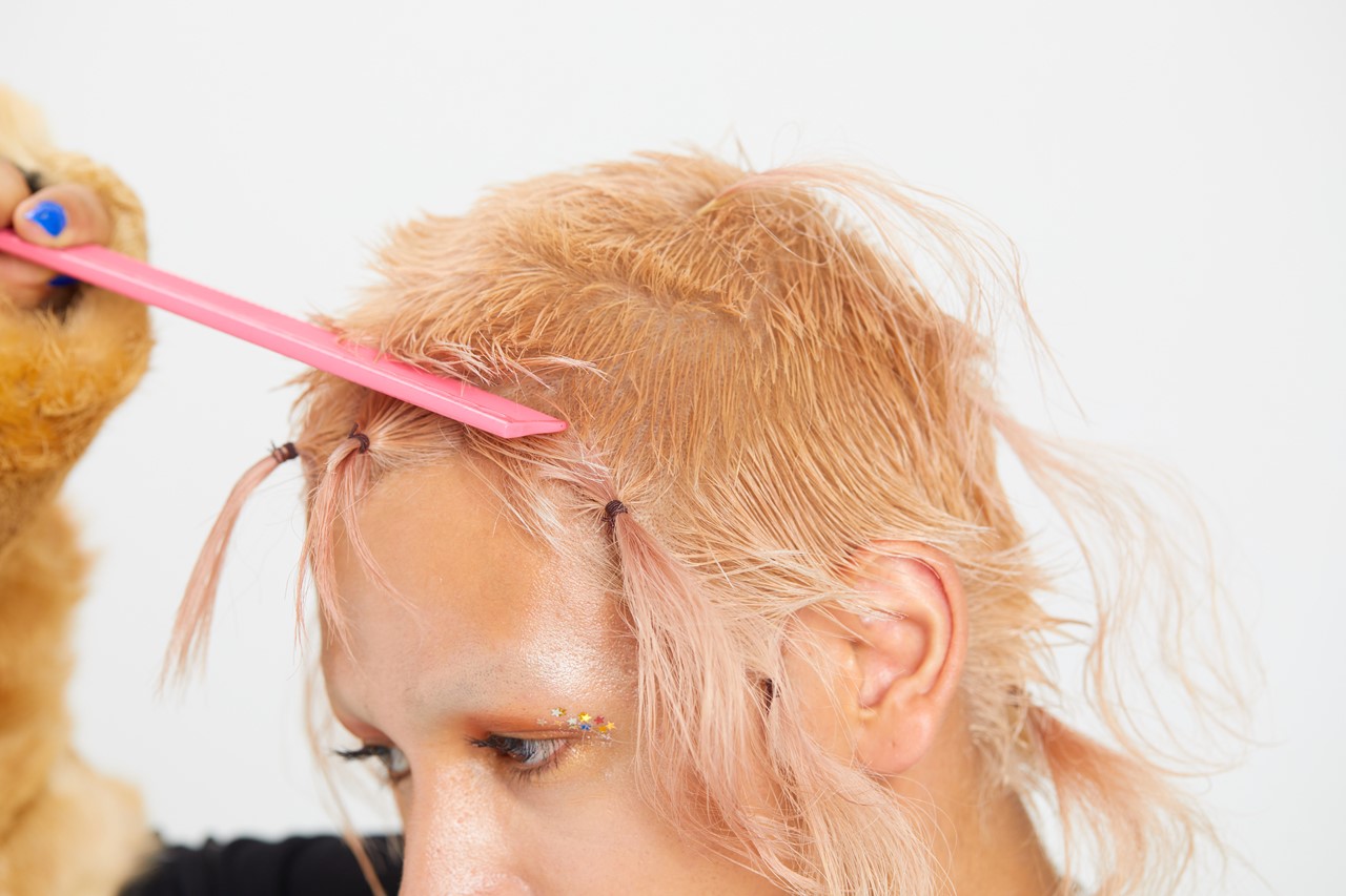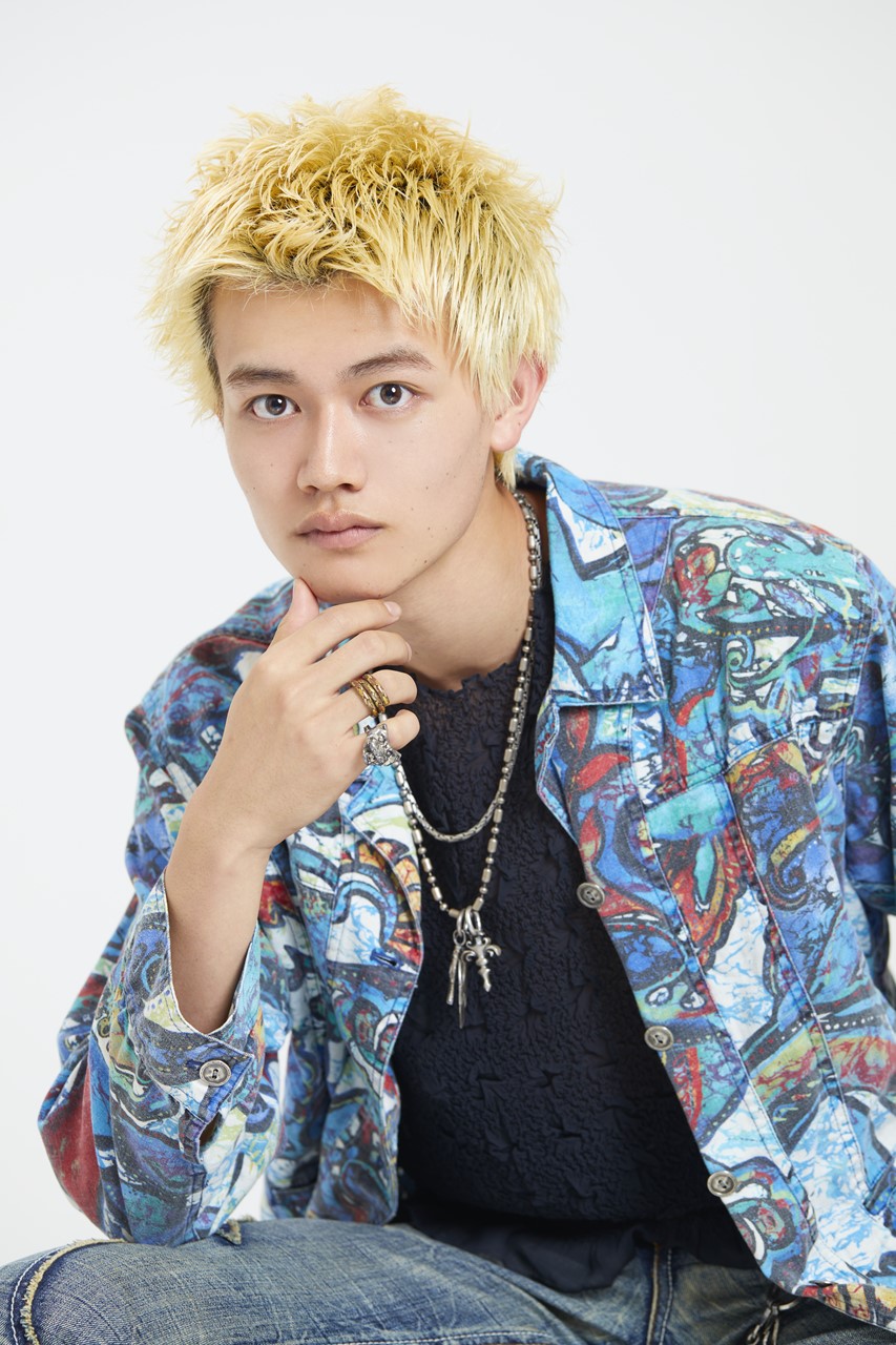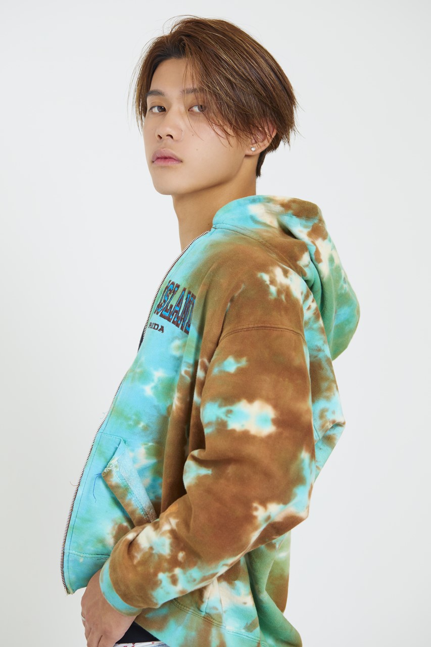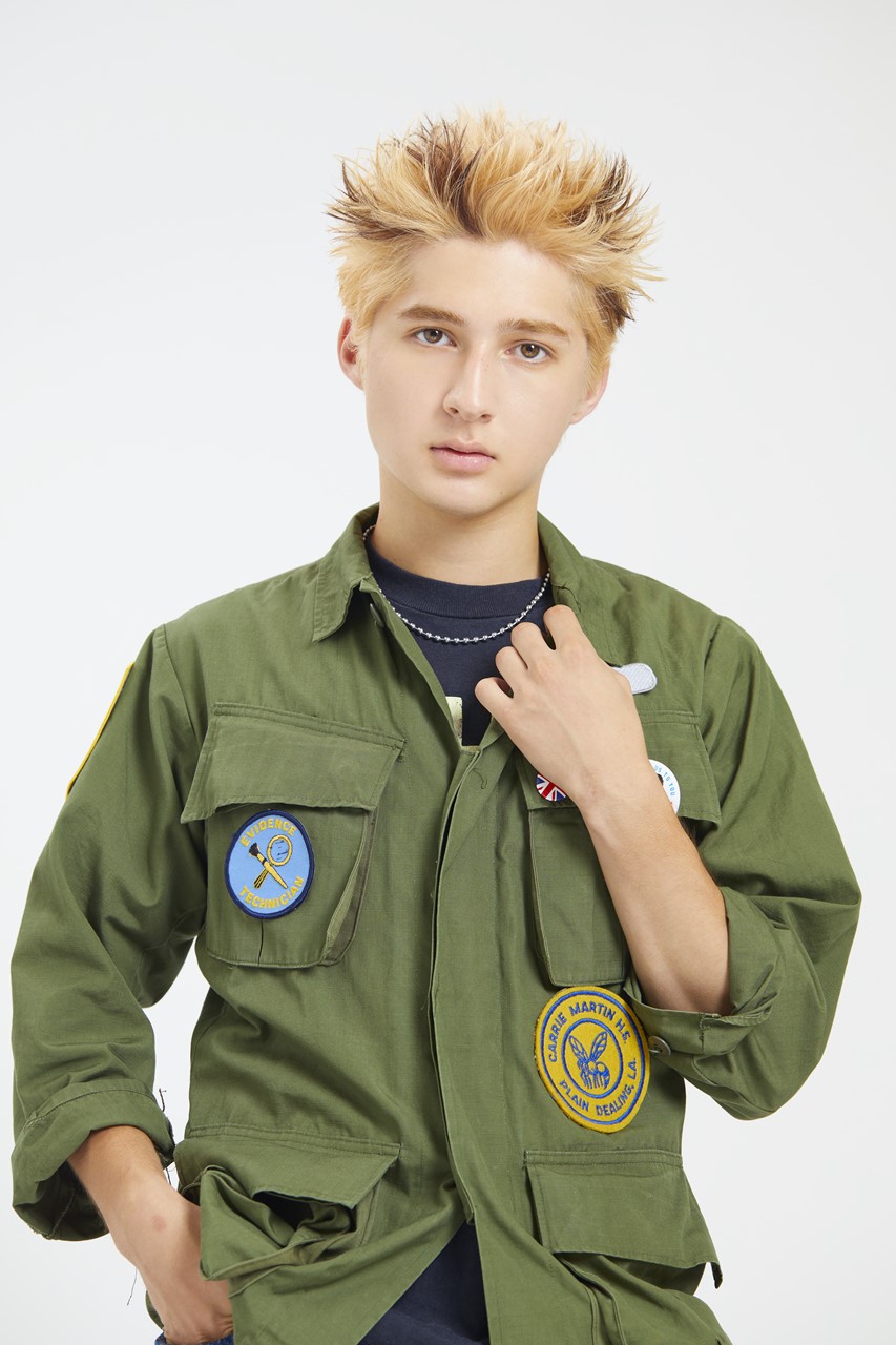 カット/ショートレイヤーベース。サイドはタイトに収まる長さにカット。トップも長めに設定し、角を残す。カラー/ブリーチ(1回)後、あえて黄色みを残したブロンドに、6トーンのブラウンをポイントでオン。ロックバンド「Sum 41」のデリック・ウィブリーをオマージュ。パーマ/なし。
