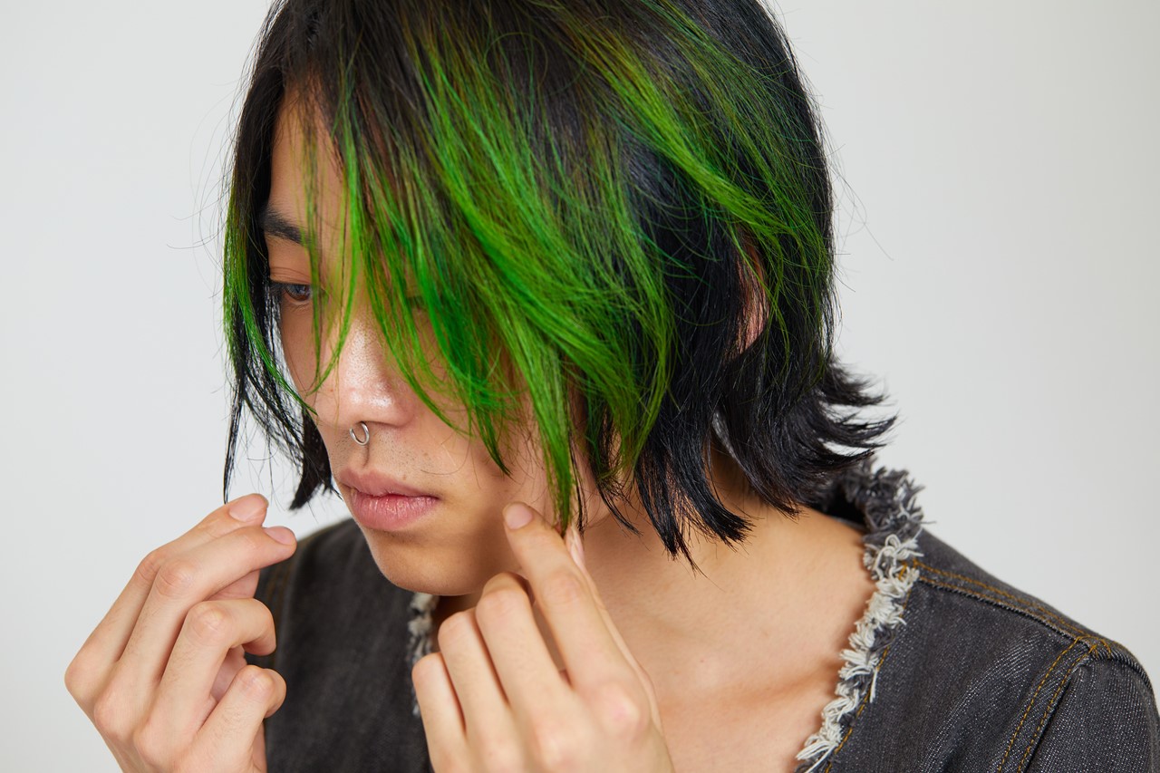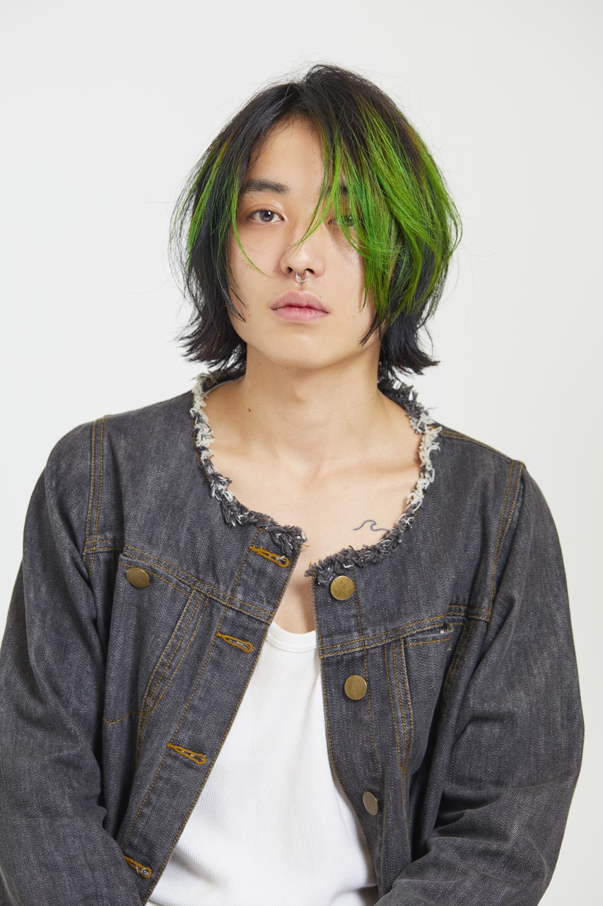カット/ボブベース。耳より後ろは毛量をしっかり取った切りっぱなしボブ。バングは目の下に設定し、耳後ろまでやや前上がりにカットする。レザーで毛束を生まれるように間引いてウルフラインを作る。カラー/前髪~もみあげの表面をブリーチ(2回)し、ネオングリーンをオン。パーマ/なし。