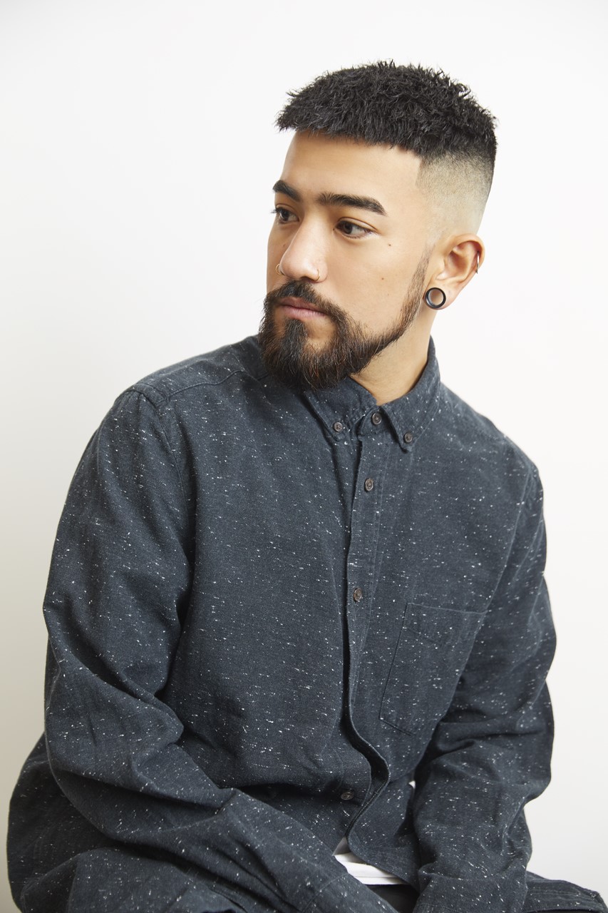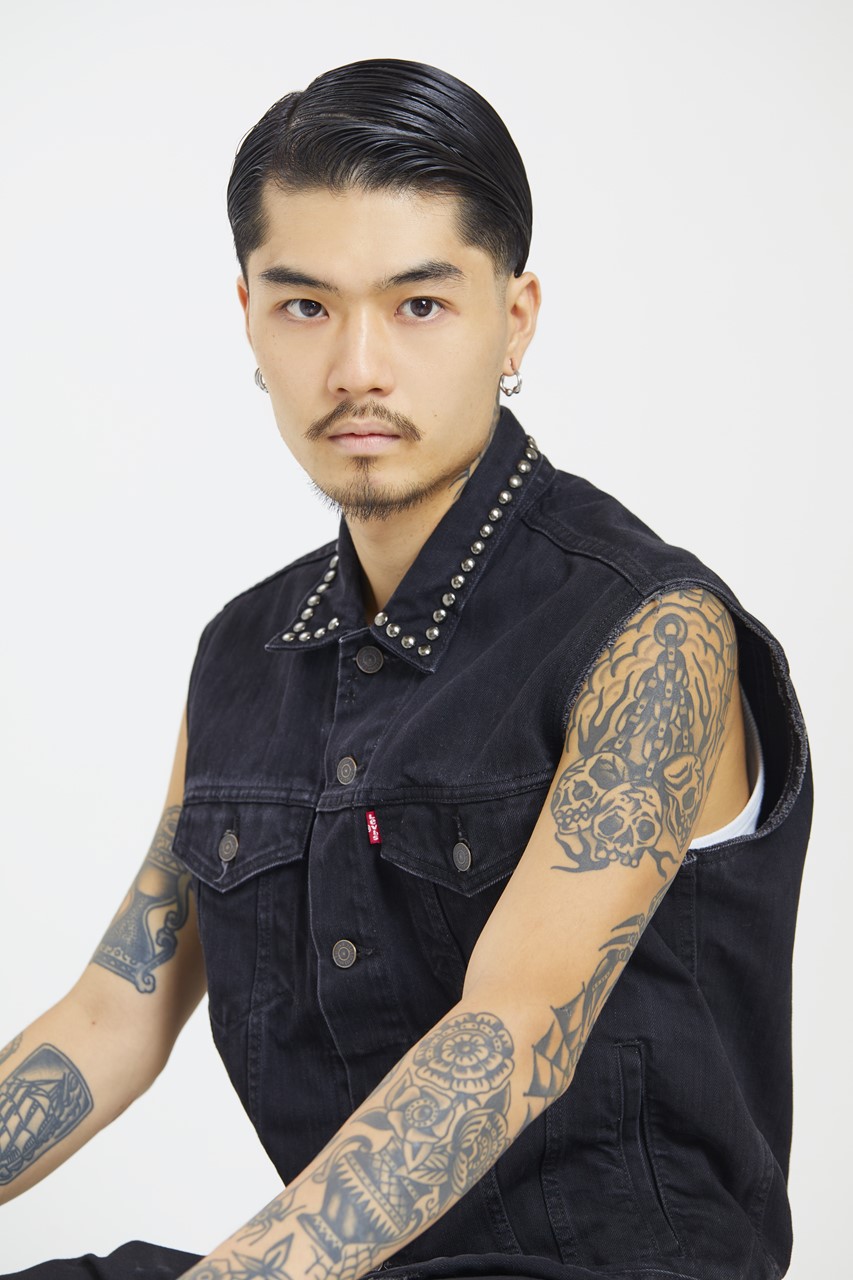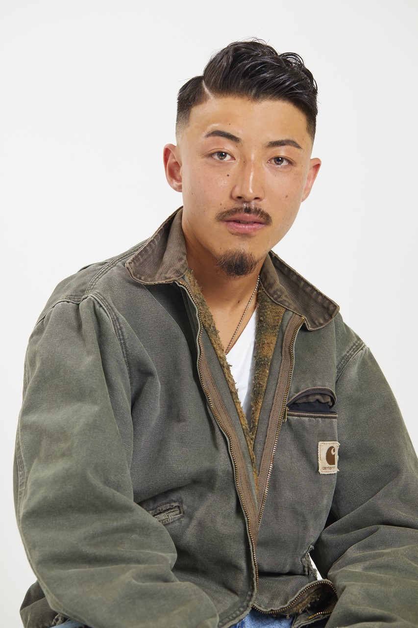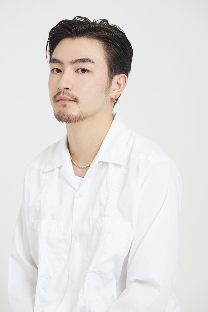 カット/サイドは0mmからのミドルスキンフェード。トップは扇形のラインにラウンドをつけてカット。セニングを毛先のみに入れることでスタイリング時に簡単に束感が出る。カラー・パーマ/なし。