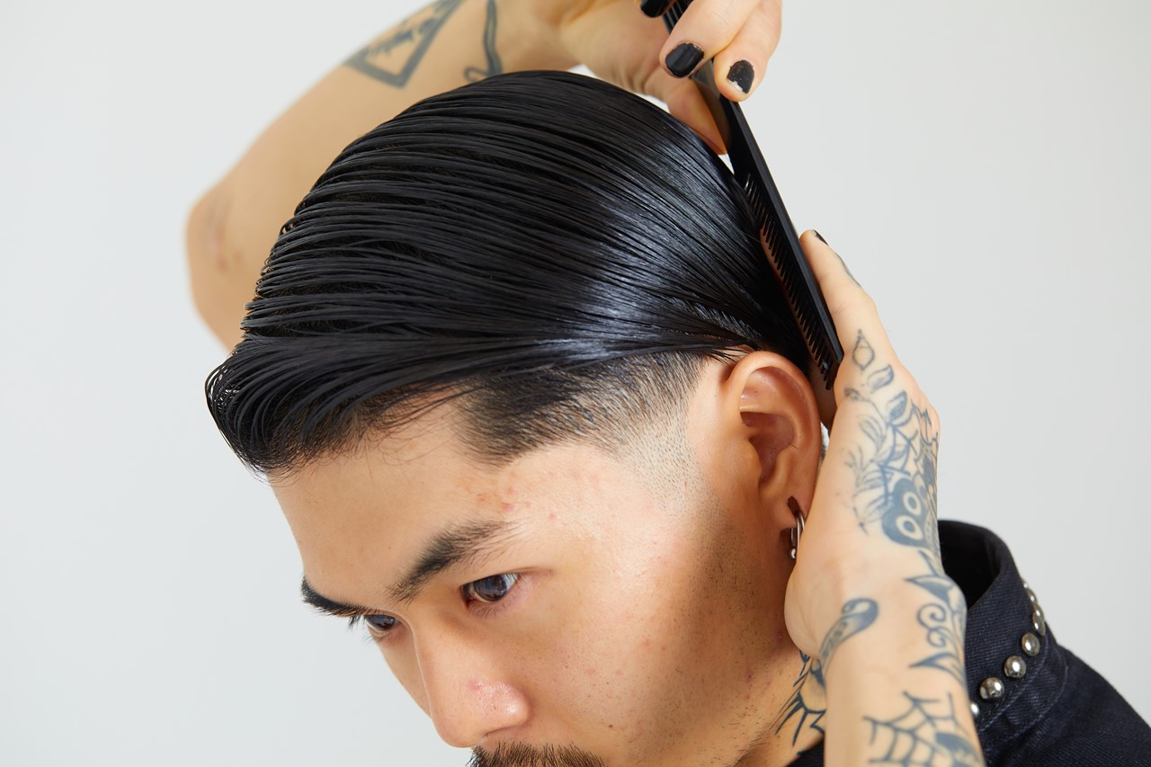 ジェルを混ぜてセット力を強くしたポマードを全体になじませ、メッシュコームを使ってフロントを立ち上げたら、最後にサイドをタイトにおさめて完成。