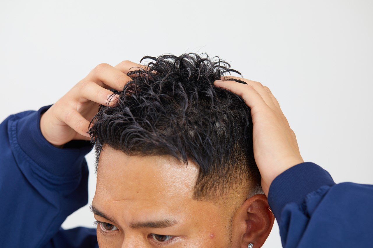 ハーフドライの状態でグリースを全体になじませたらコームでざっと全体を整えたのち、手でもみながらくずしてラフなカールを出したら完成。