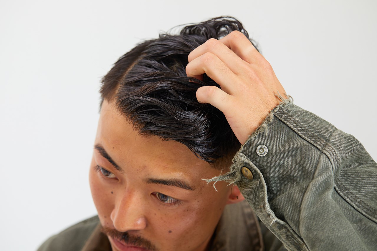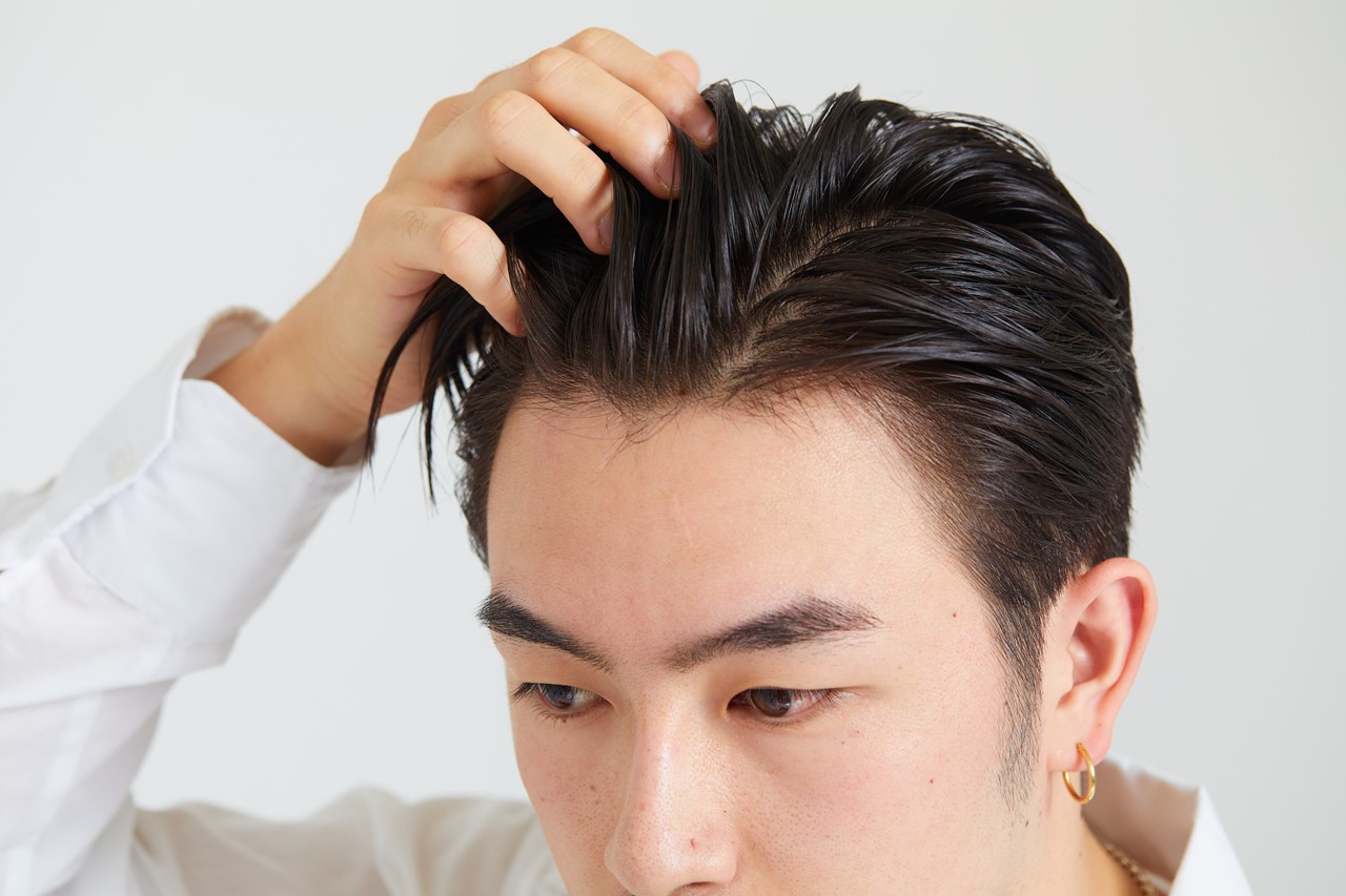 ドライヤーで前から後ろに毛流れを作りながら乾かしたら、マットワックスを全体になじませてから手で整えて完成。ラフに崩れてもかっこいいスタイルだ。