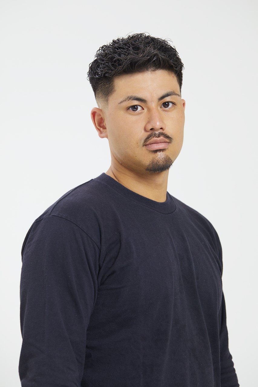 カット/ウェイトラインは高め、スキンは低めで、グラデーション幅を広めにした上品なフェード。前髪はウェイトにつなげ、トップは2~3cmで短めに仕上げる。根元から毛先まで均一にセニングを入れて軽めの質感に。カラー/なし。パーマ/全体にツイストパーマ。接合部までしっかり巻くことでスキのないスタイルが完成。