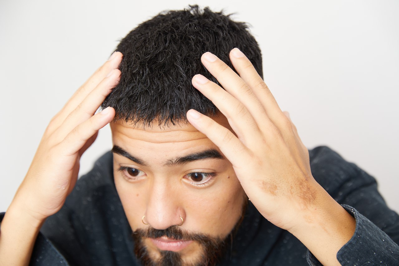 カット/アンダーはミドルの高さのスキンフェード。トップは頭頂部に向けて長さが出るように仕上げる。カラー/なし。パーマ/15mmロッドを使用して順巻きと逆巻きをミックスしてラフでランダムな動きを狙い、外国人のようなクセ毛風の自然な仕上がりに。短い部分もピンパーマを使って動きを出してなじませる。