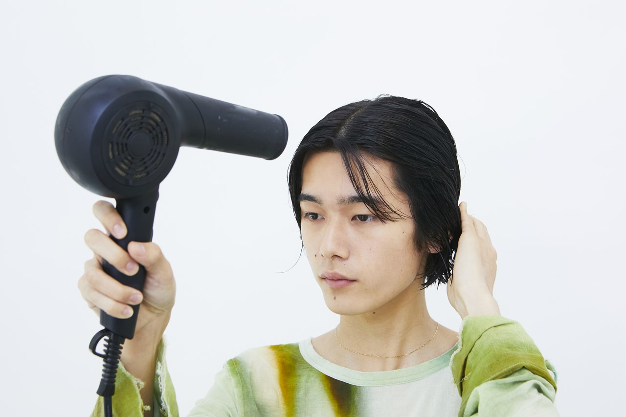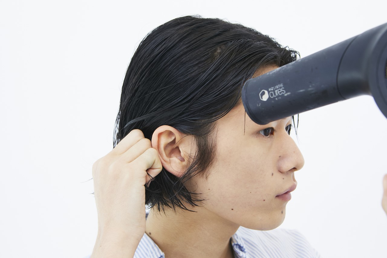毛流れに沿って髪を引っ張りながら、ドライヤーで乾かす。冷風で仕上げると形がキマりやすくなる!