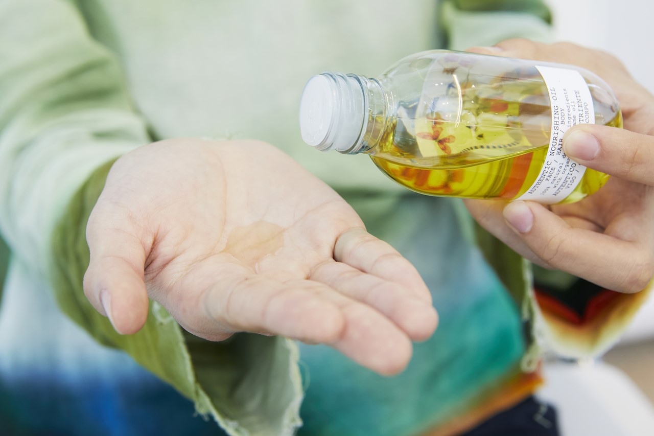 スタイリングオイルはベタつきすぎないくらいの量を2~3回に分けて付ける。バーム系ワックスでもOK。