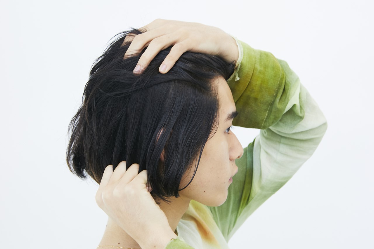 シアバターを手のひらに付けて、オールバックにするようにかき上げよう。髪の質感がしっとりまとまる。