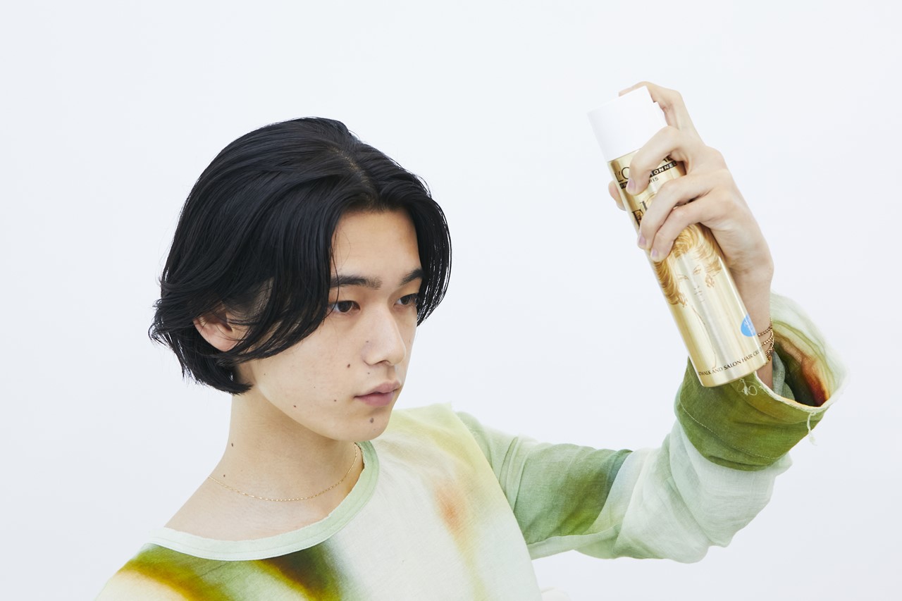ツヤ出しスプレーでフィニッシュ。ハードスプレーより、コームでとかしたとき粉が出ないタイプが今っぽい。