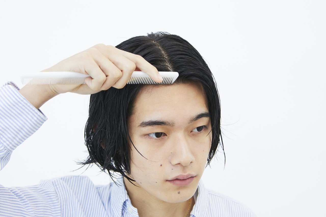 タオルドライ後、ベースオイルを付けたら分け目をつけたいところを決め、コームでとかしてなじませる。