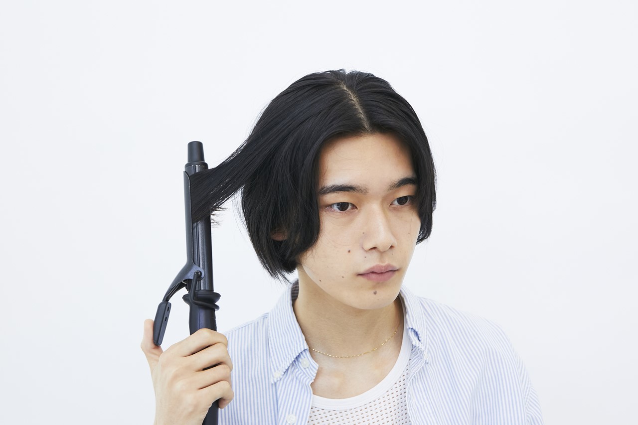 ドライワックスを使い、髪の内側を耳にかけるように毛流れを作る。全体ではなく部分的に付けていこう。