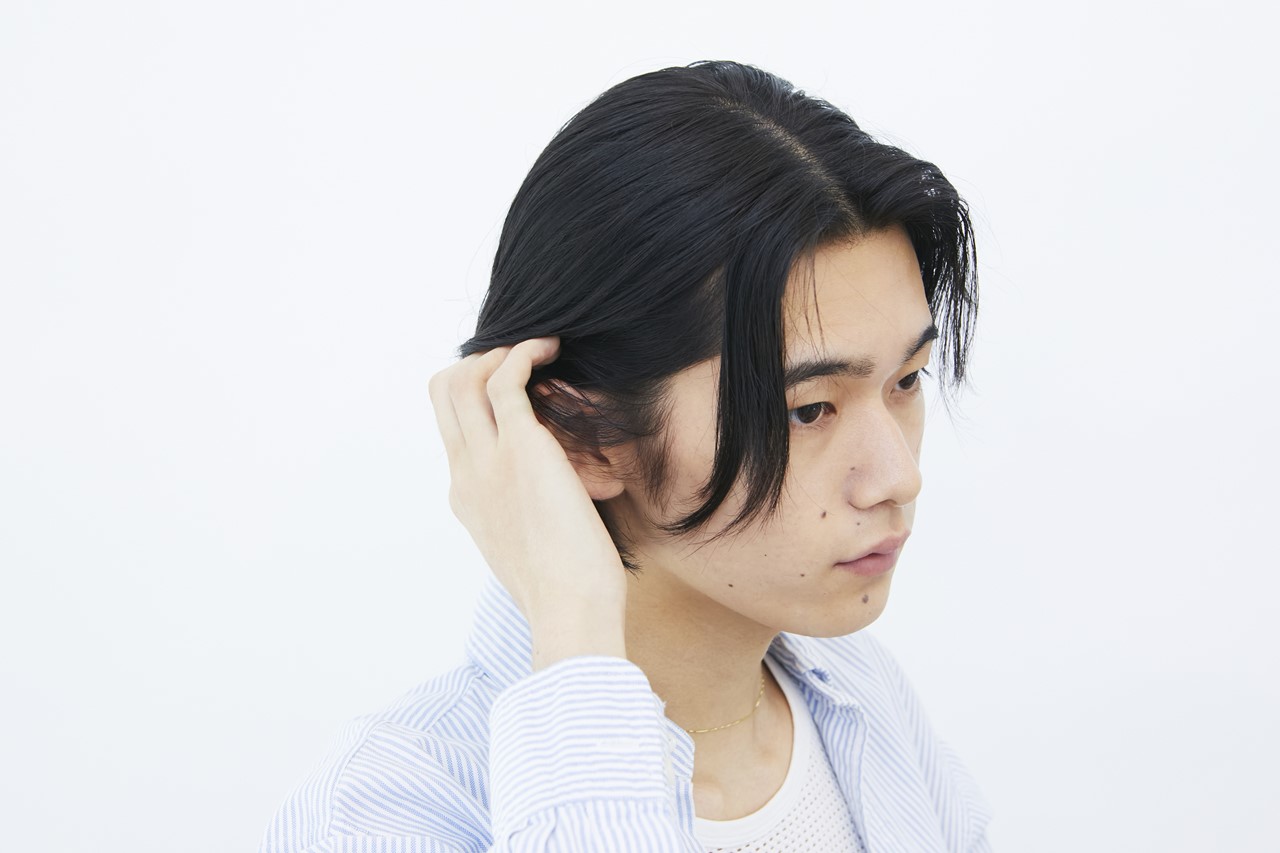 まずはドライな質感で、頑張りすぎないプレッピーテイストを演出。重ければモードな雰囲気になりますが、かき上げるスタイリングにすると都会的なムードで今っぽくキマります。