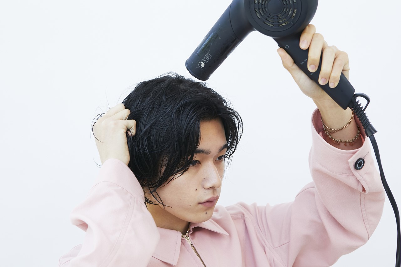 ドライヤーを弱風にして、髪を握ったり振ったりしてクセを出す。乾燥させすぎないように注意を。