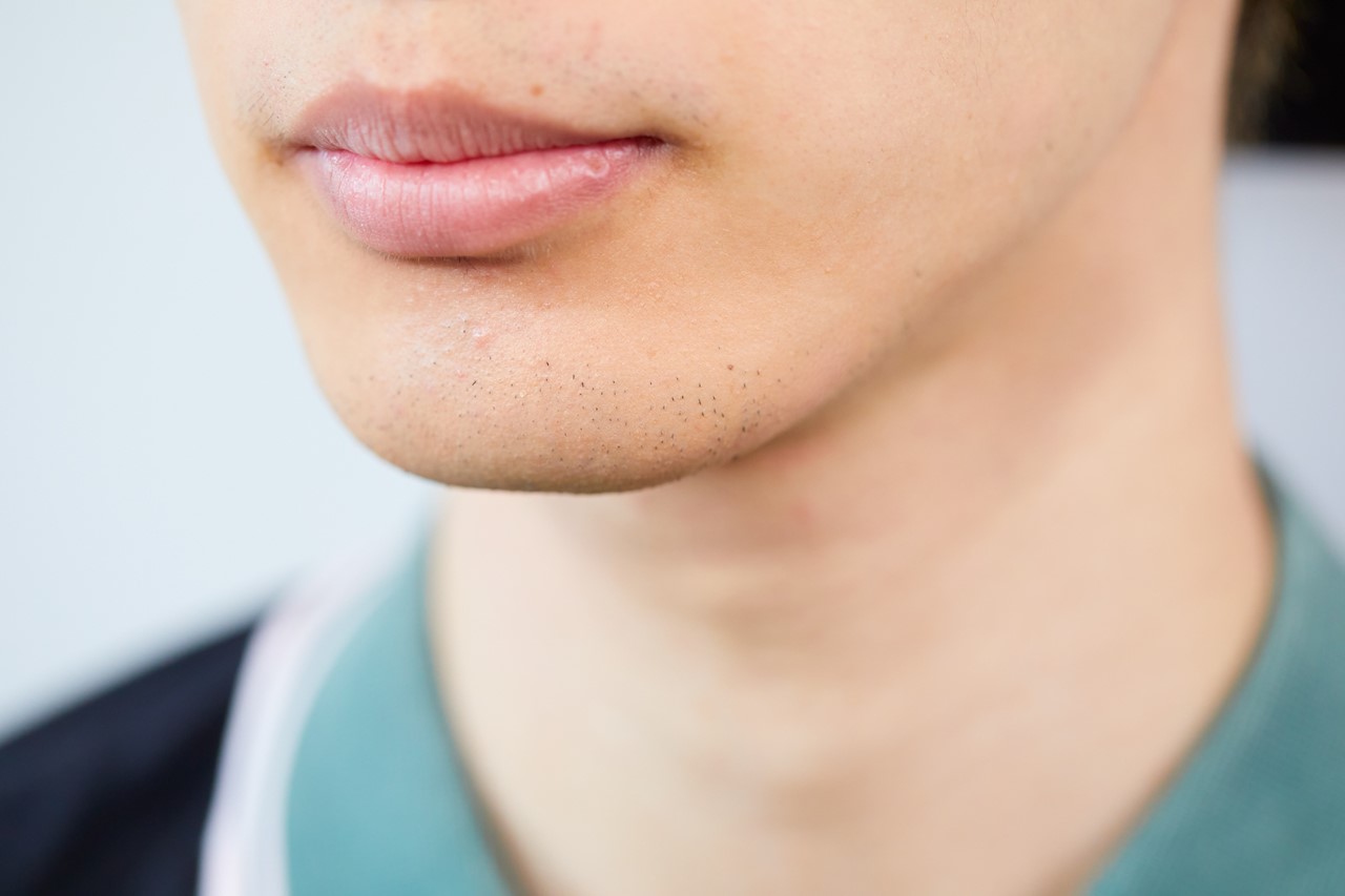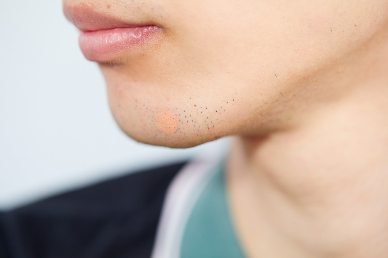 目の下など皮膚の薄い部分を厚塗りすると浮いてしまうが、皮膚の厚いあごは目立たないので、カバー力の高いクリームタイプを点で置く。