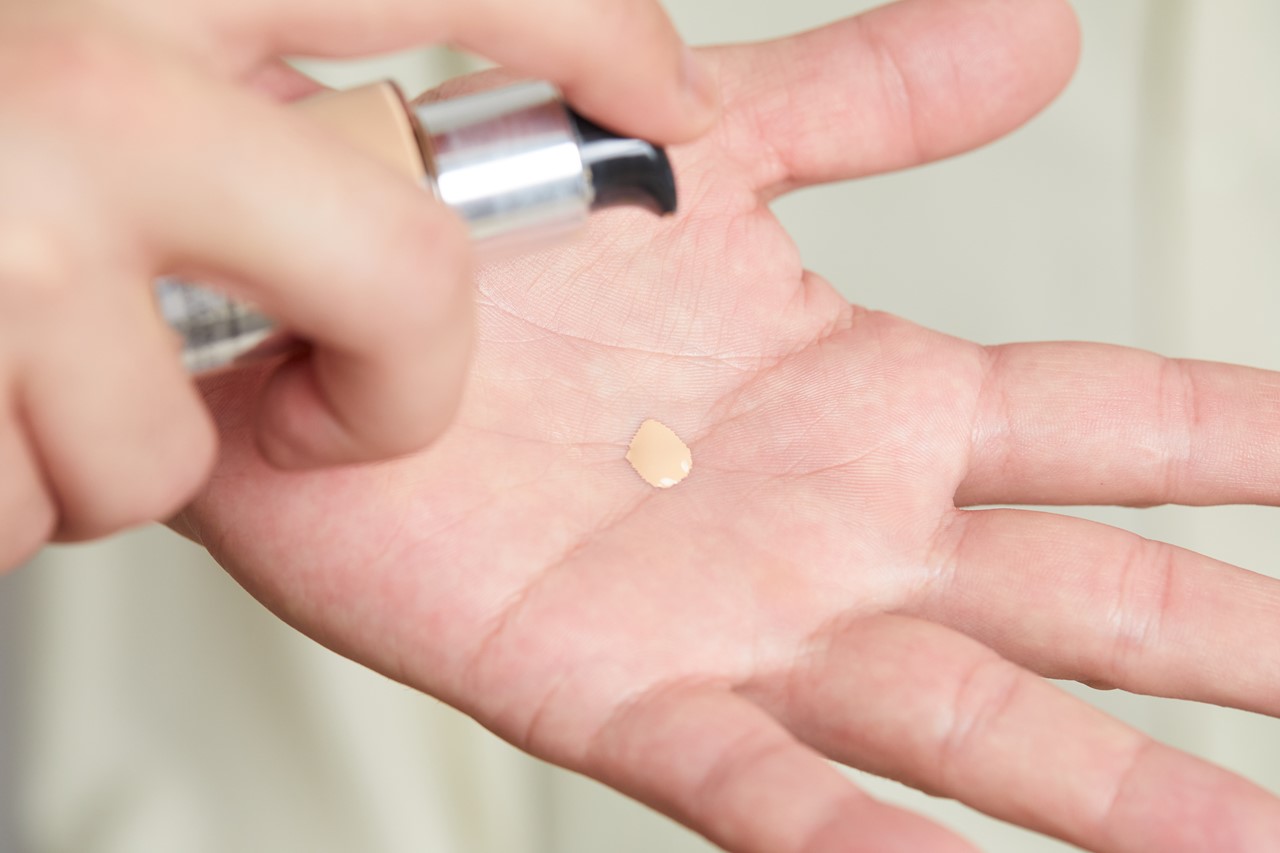 コンシーラーでニキビをカバーするだけでは、肌色との差が目立ってしまうので、ふだん使いのリキッドファンデを重ねていく。