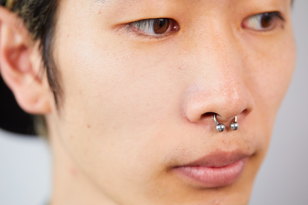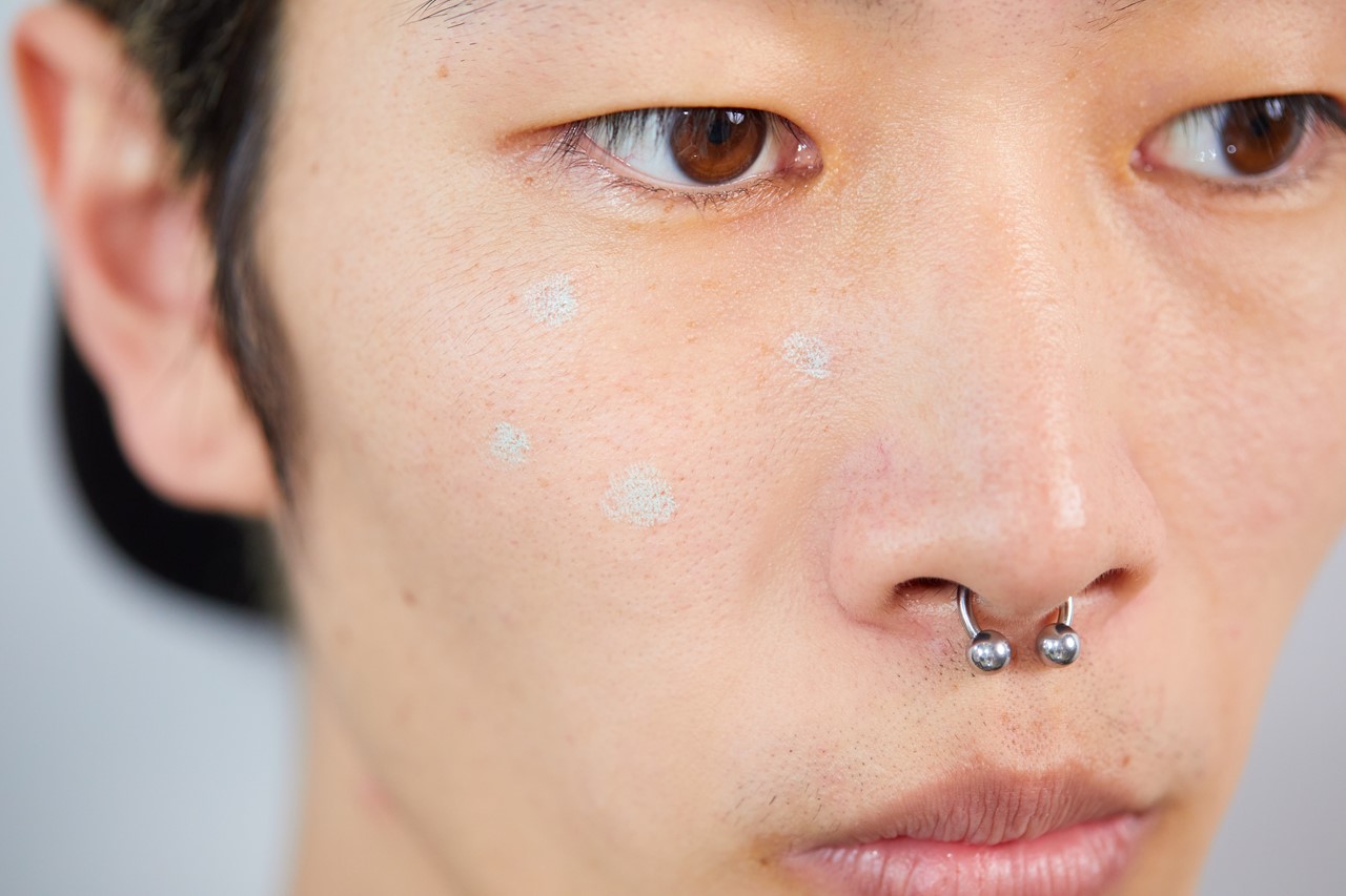 赤みが出やすいのはほおや小鼻のまわり。気になる部分に緑のコンシーラーを点で置く。一度にたくさん付けず、少しずつ足していく。