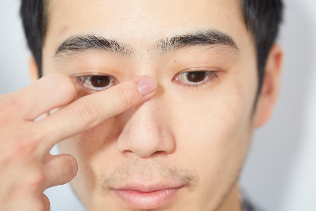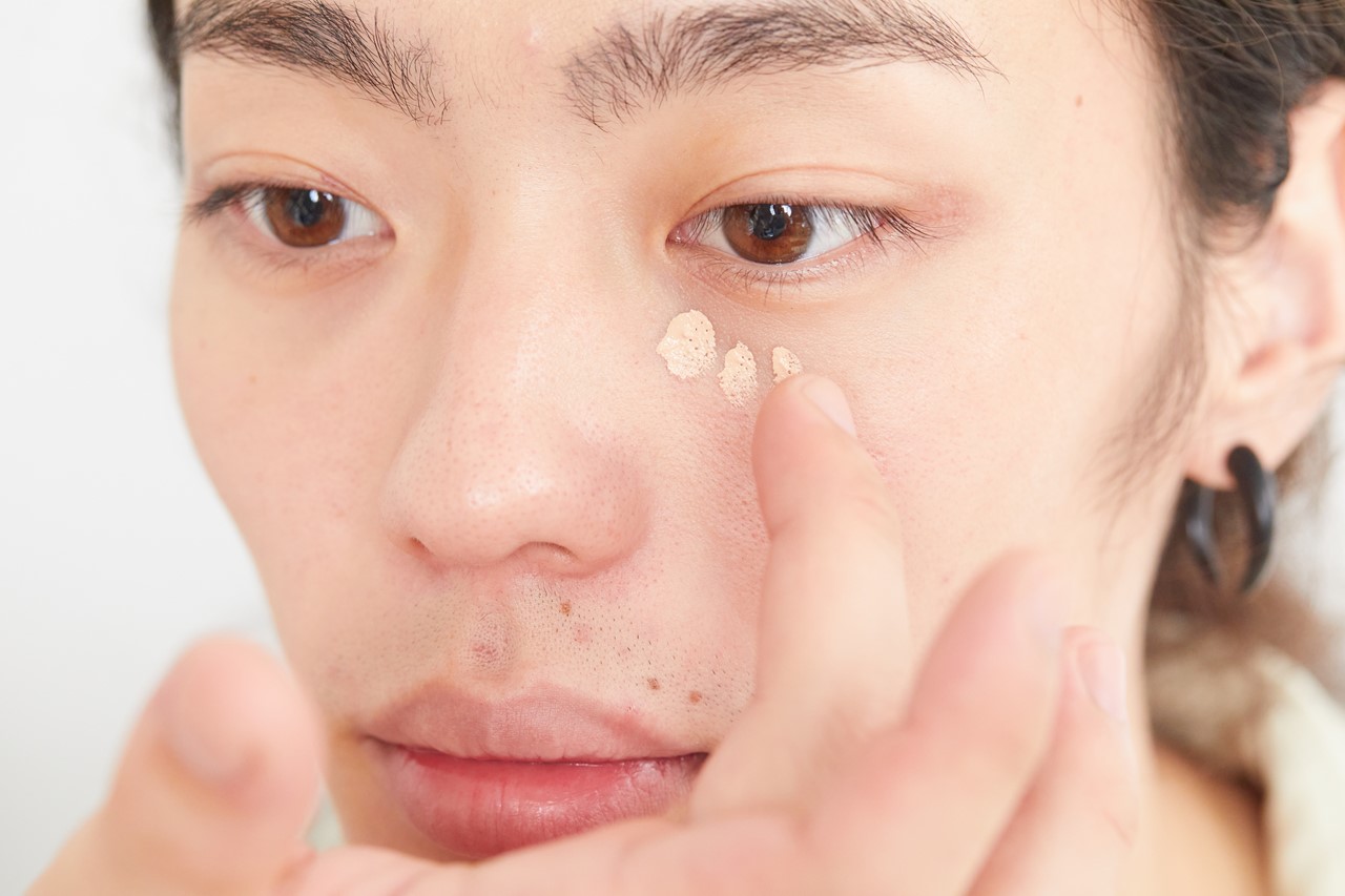 目の下のクマも血色の悪さが原因。ホットタオルでも解消できるが、メイクでカバーするときは明るい色のコンシーラーを点で置いて。