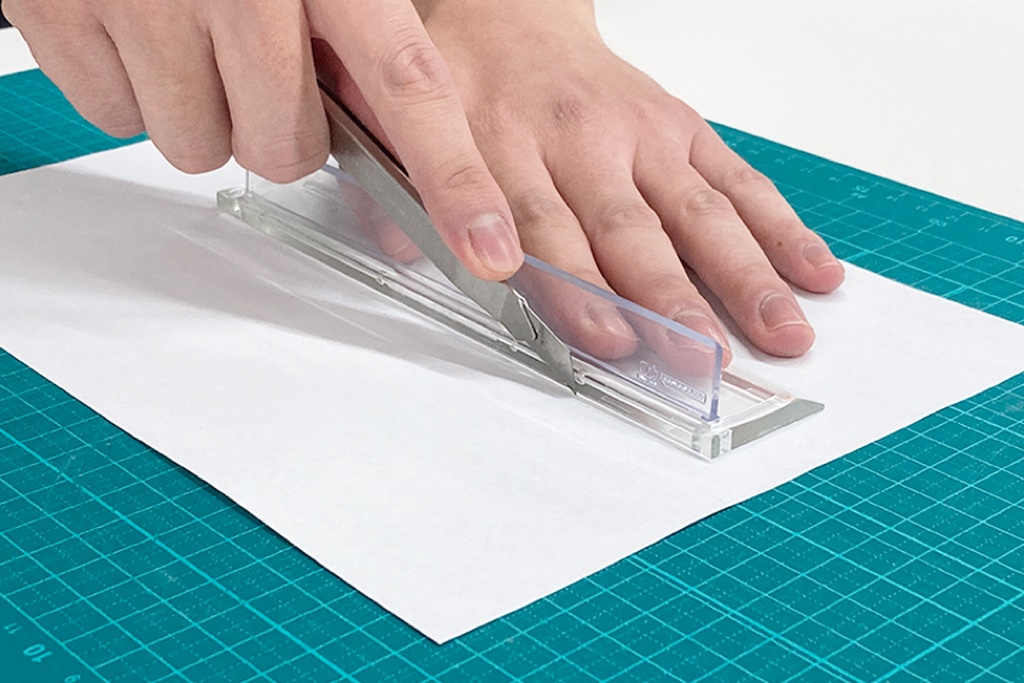 カッター使用時に誰しも一度は手を傷つけてしまったり、切りそうになってヒヤリとしたことがあるはず。そんな不安を少しでも解消できる定規だ。表面についているガードプレートを開くと指先を保護するガードになり、安全にカッターを使用することができる。裏面には滑り止め用の細かいマット加工が施されており、滑り止めの効果が期待できる。