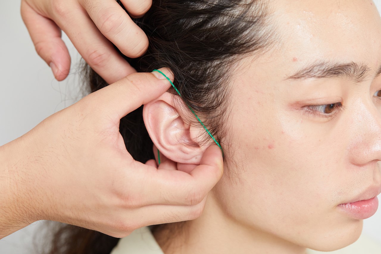 目のむくみはメイクではなく、マッサージやリンパ流しで解消。まず、両耳の付け根に輪ゴムをかけ、顔まわりの筋肉をほぐす。