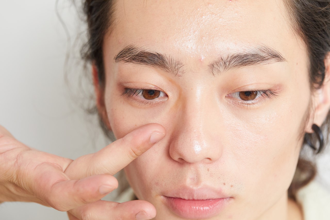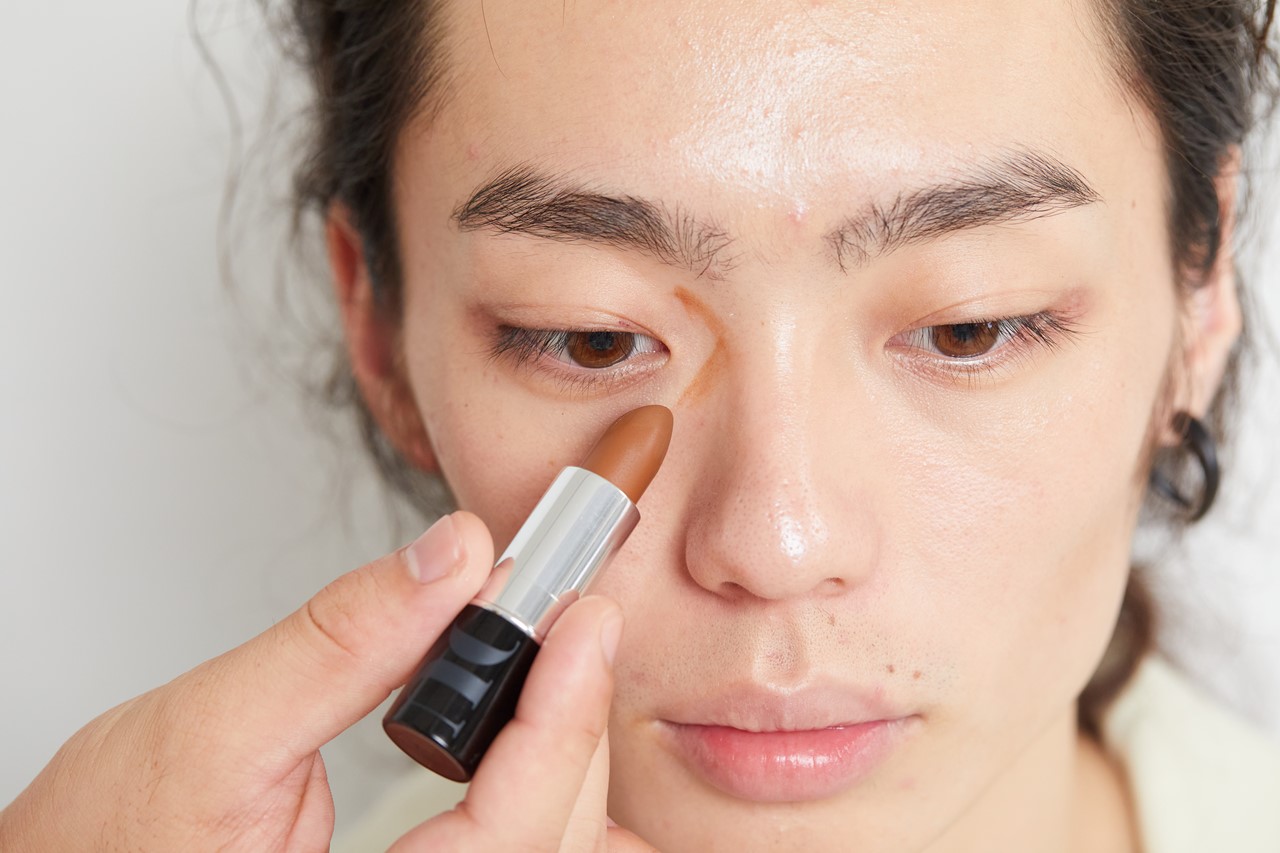 目と目が離れて、顔がのっぺり見える目元は、鼻根の脇にローライトを。コンシーラーやファンデでくの字のラインで影をつくる。