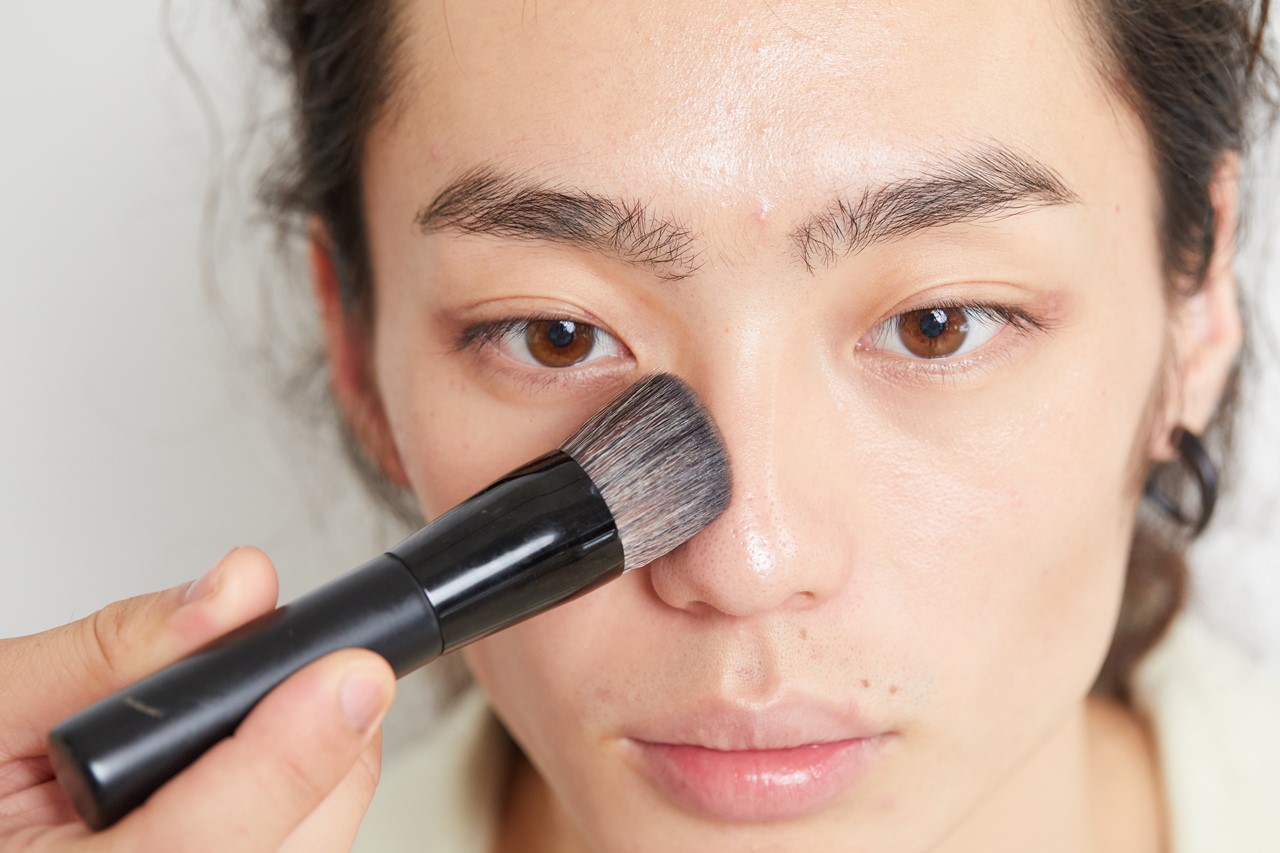最後に、ファンデーションブラシでなじむように仕上げて。鼻根脇に影ができることで、目と目の距離を近づけてみせることができる。