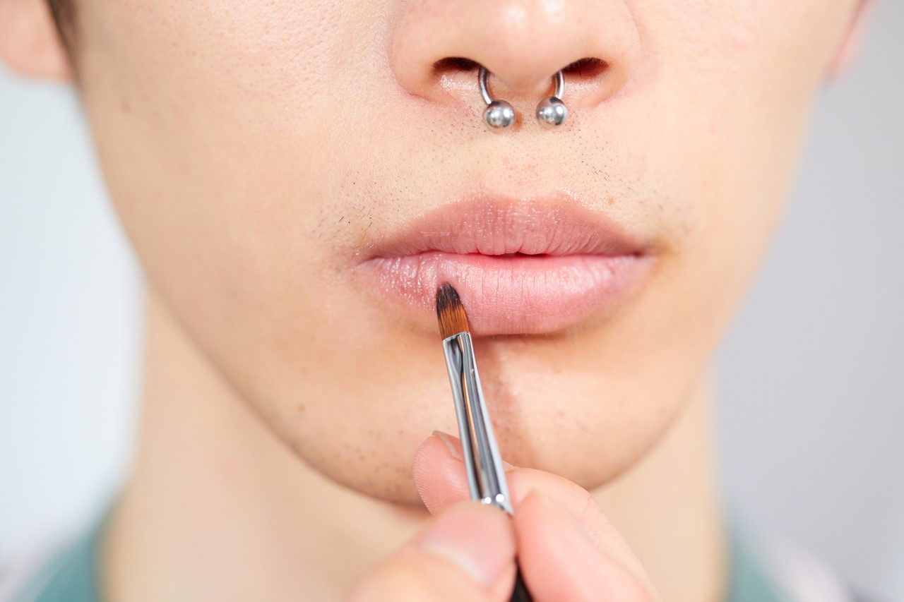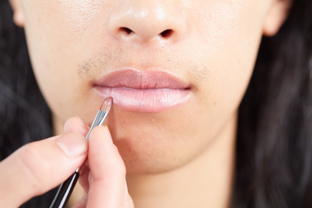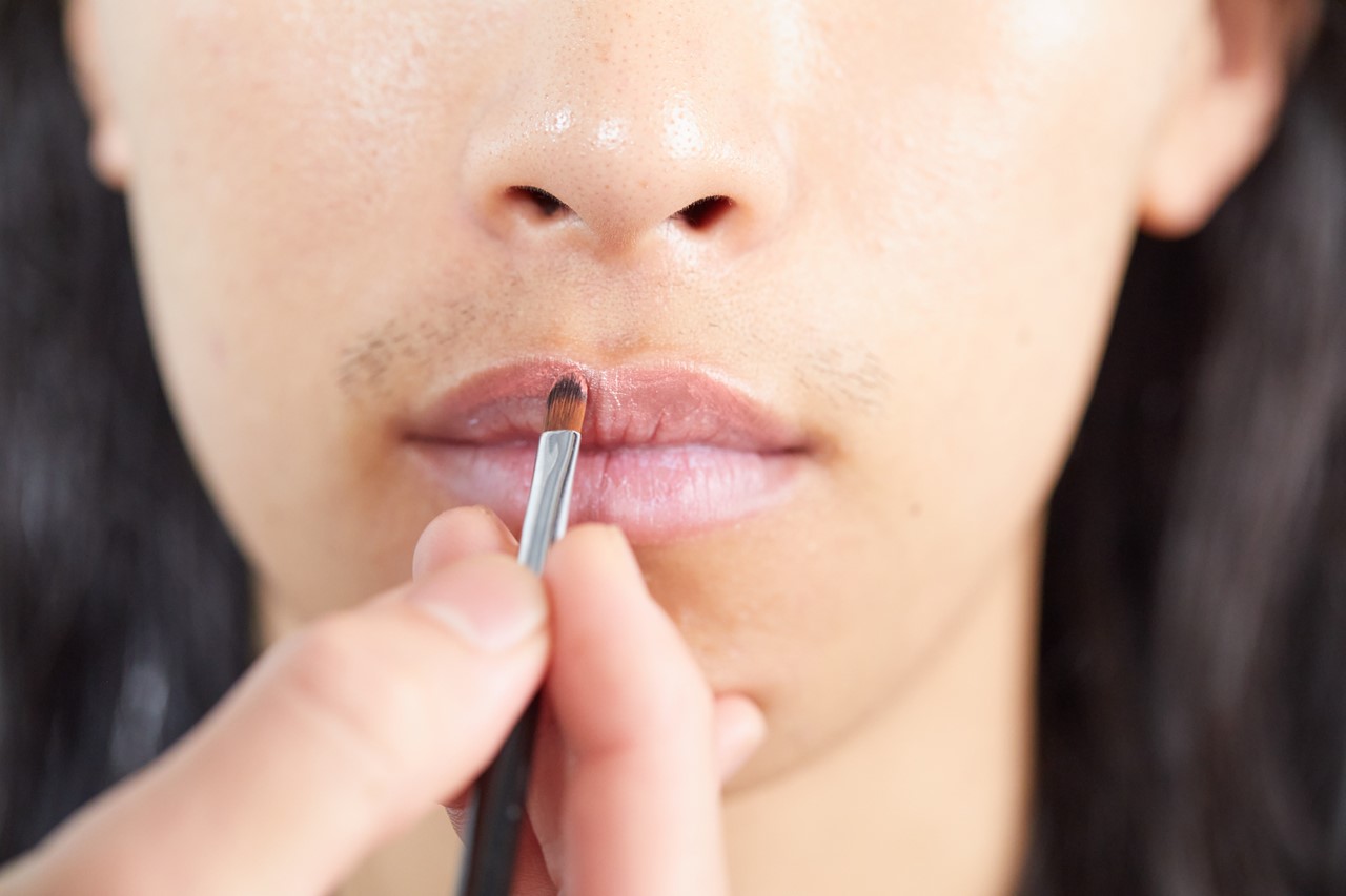 自分の唇の輪郭に沿って、紅筆で縁取る。このとき、輪郭を修正する必要はない。唇の形にコンプレックスがないなら、元の形のままでOK。
