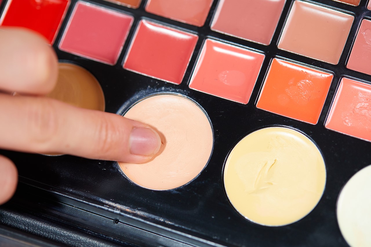唇にコンシーラーをのせないように、ほおをひっぱりながら、くすんでいる口角めがけて点でのせる。トントンとたたいて、肌になじませて。