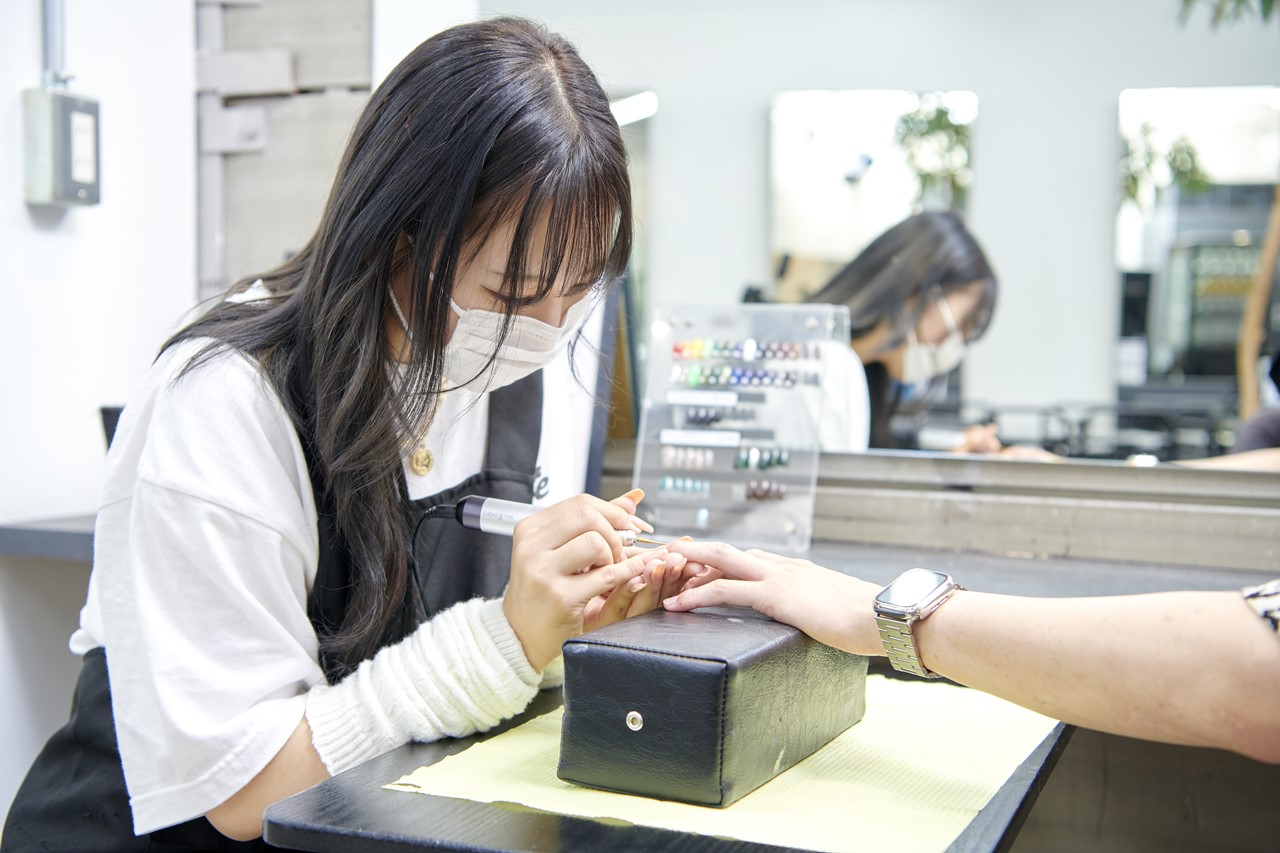 髪色とネイル、両方をやりたいというお客さまは増えていますが、髪色とネイルの色味を同系色でまとめるのがポイント。特に初めてネイルをされる方はデザインに迷うと思いますので、髪色と合わせておくと洋服にも合わせやすくなります。