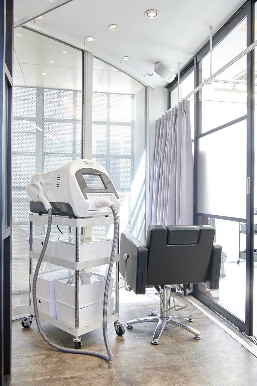 連射式業務用脱毛機「CREAR/SP-ef」による光脱毛は、1回3,300円。ヘアメニューとして別途、えり足の脱毛もある