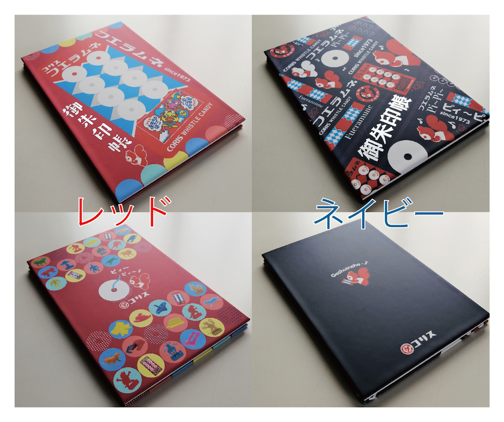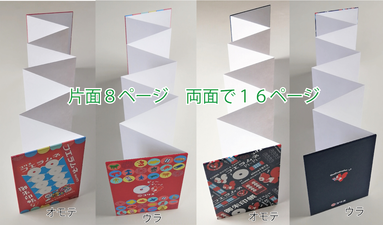 カラーはレッドとネイビーの2種類。レッドの裏表紙はオマケの写真がたくさん掲載されており、ネイビーはシンプルなデザイン。また片面8ページ、両面で16ページの蛇腹加工のため、薄くて軽く、かさばらないので持ち運びにも便利だ。