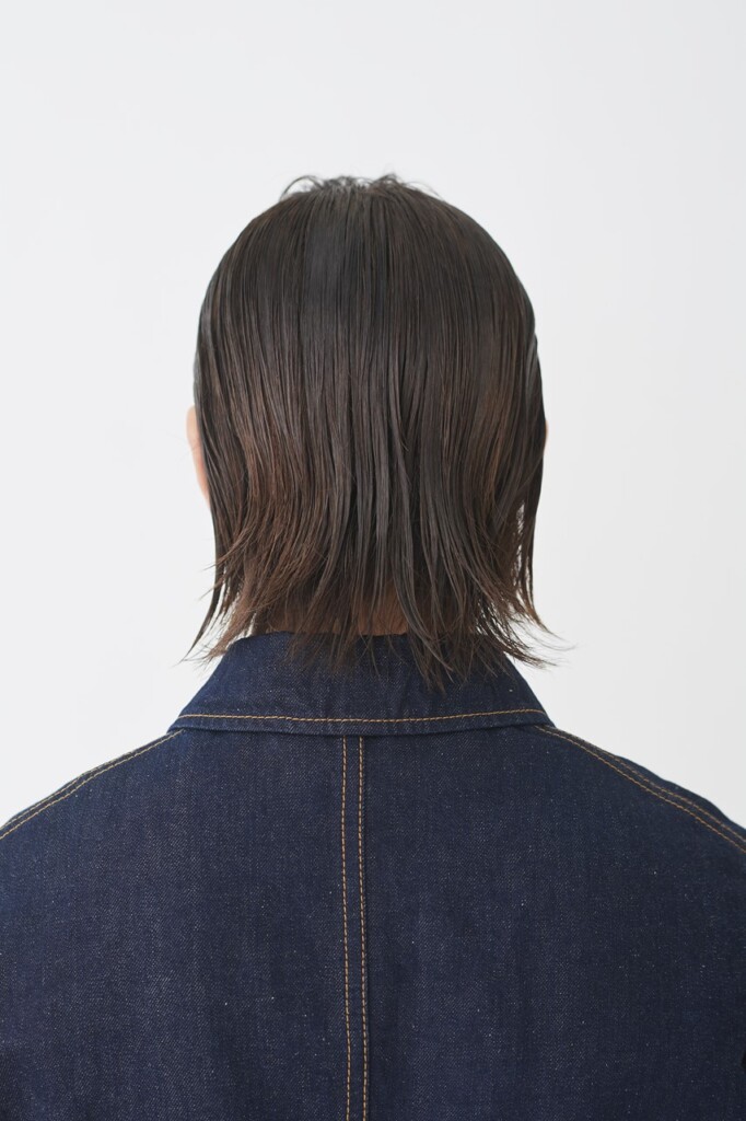 全体的に後ろから前への毛流れを作り、特に顔まわりは前に引き出してマッシュラインを強調する。マットワックスを少量なじませ、顔まわりはマッシュラインをアピール。全体的に前方に流す。