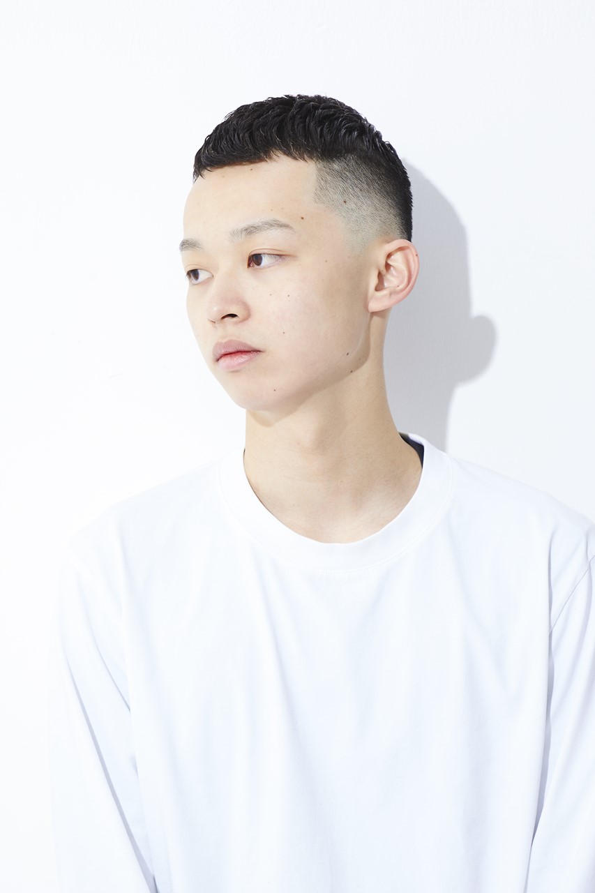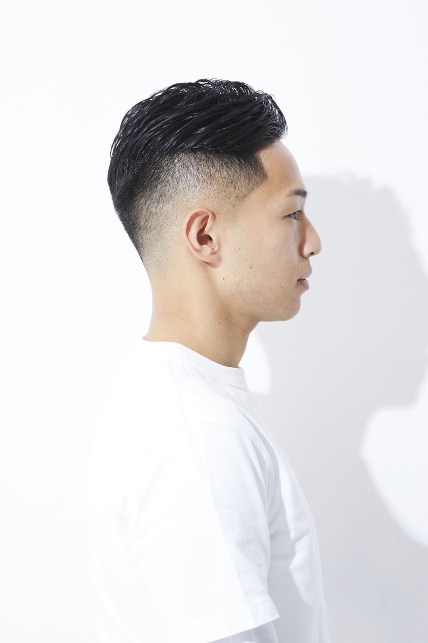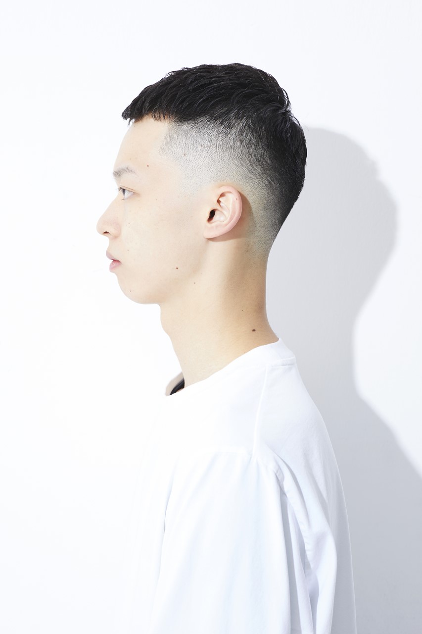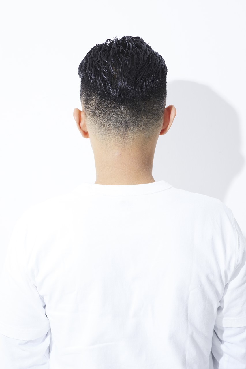 カット/フェードのキワは0mmスタート。スキンフェードでナチュラルかつ上品さを出す。トップは後ろへ流しやすい長さにカット。量は適度に残し、中間から毛先を細束にならないようにすく。
