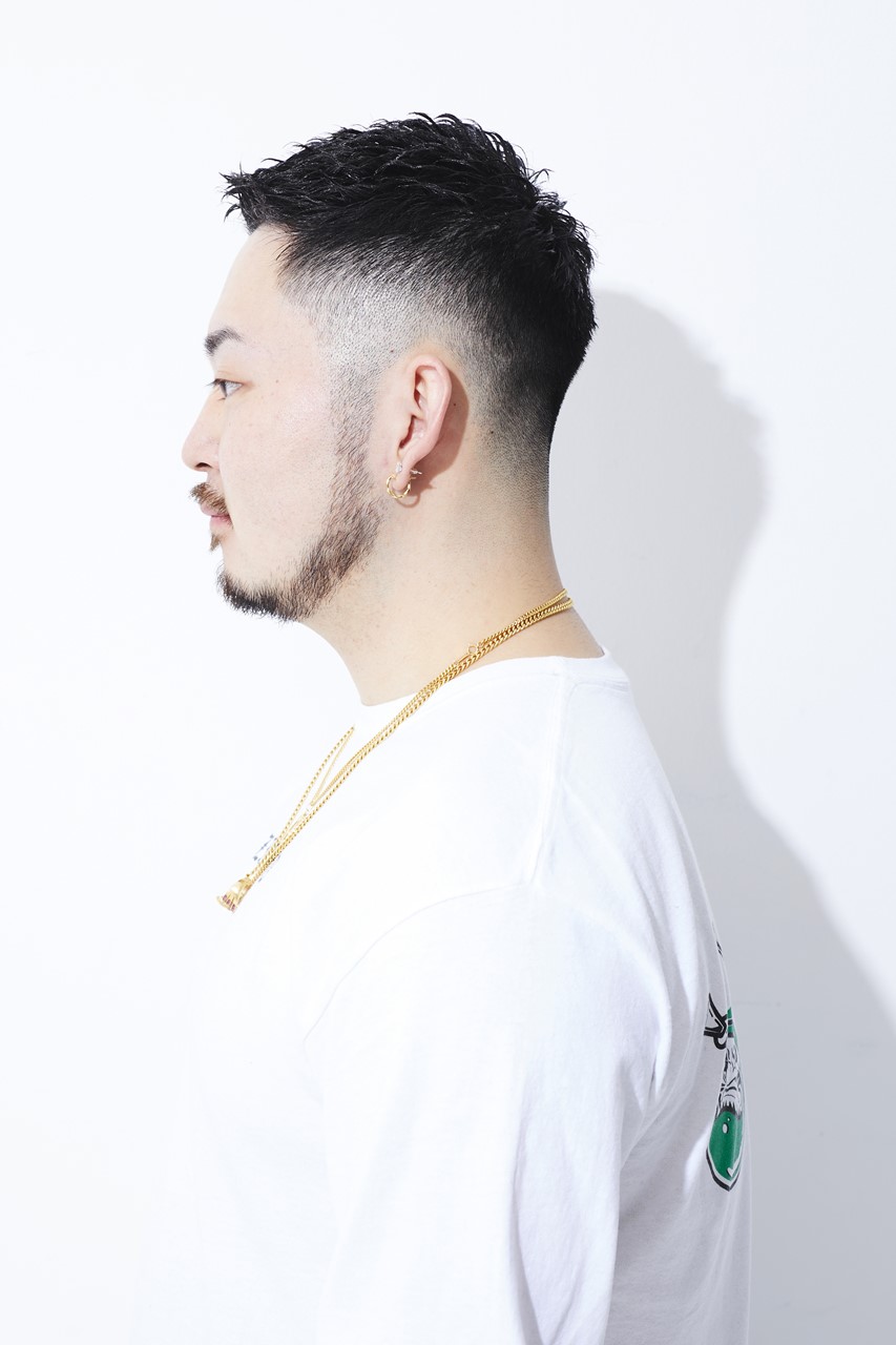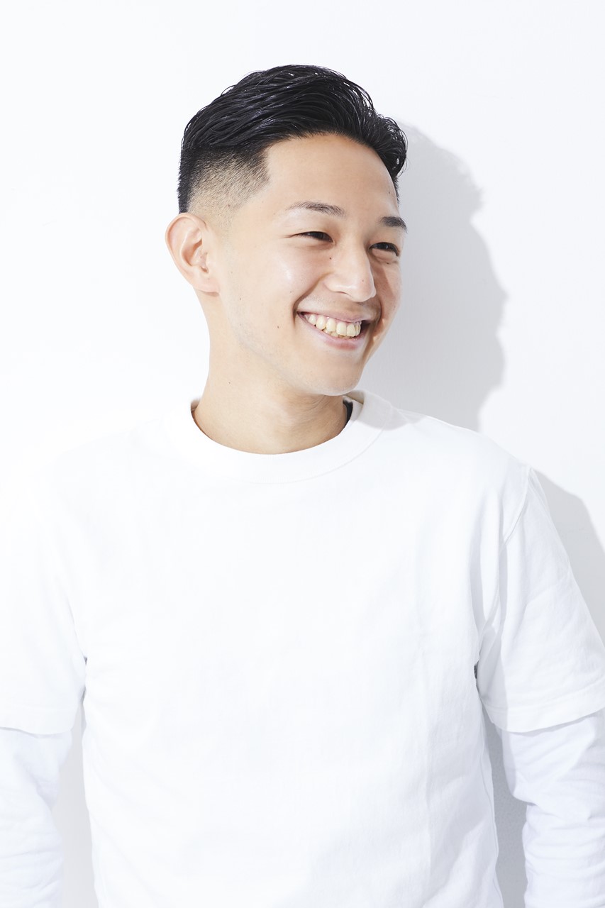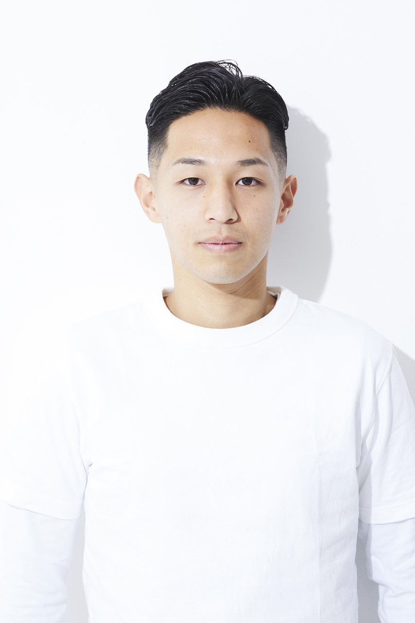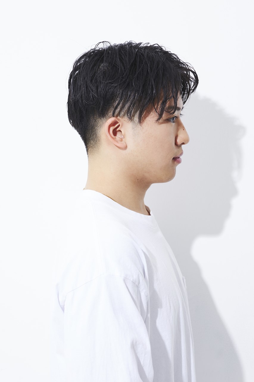 カット/フェードのキワは0mmスタート。スキンフェードでナチュラルかつ上品さを出す。トップは後ろへ流しやすい長さにカット。量は適度に残し、中間から毛先を細束にならないようにすく。
