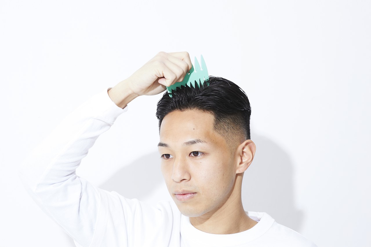 前へおろすようにドライしたあと、グリースを髪全体に揉み込む。あとは手ぐしでバランスを調整すれば完成だ。