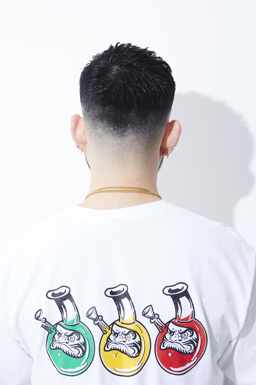 カット/フェードは0.3mmからのグラデーション。クロップは4cmでカット。パーマ/クセがある場合はパーマなし。直毛の場合は軽く動くように、ピンパーマをレンガ状に配置。3回転ねじって根元にボリュームをつける。