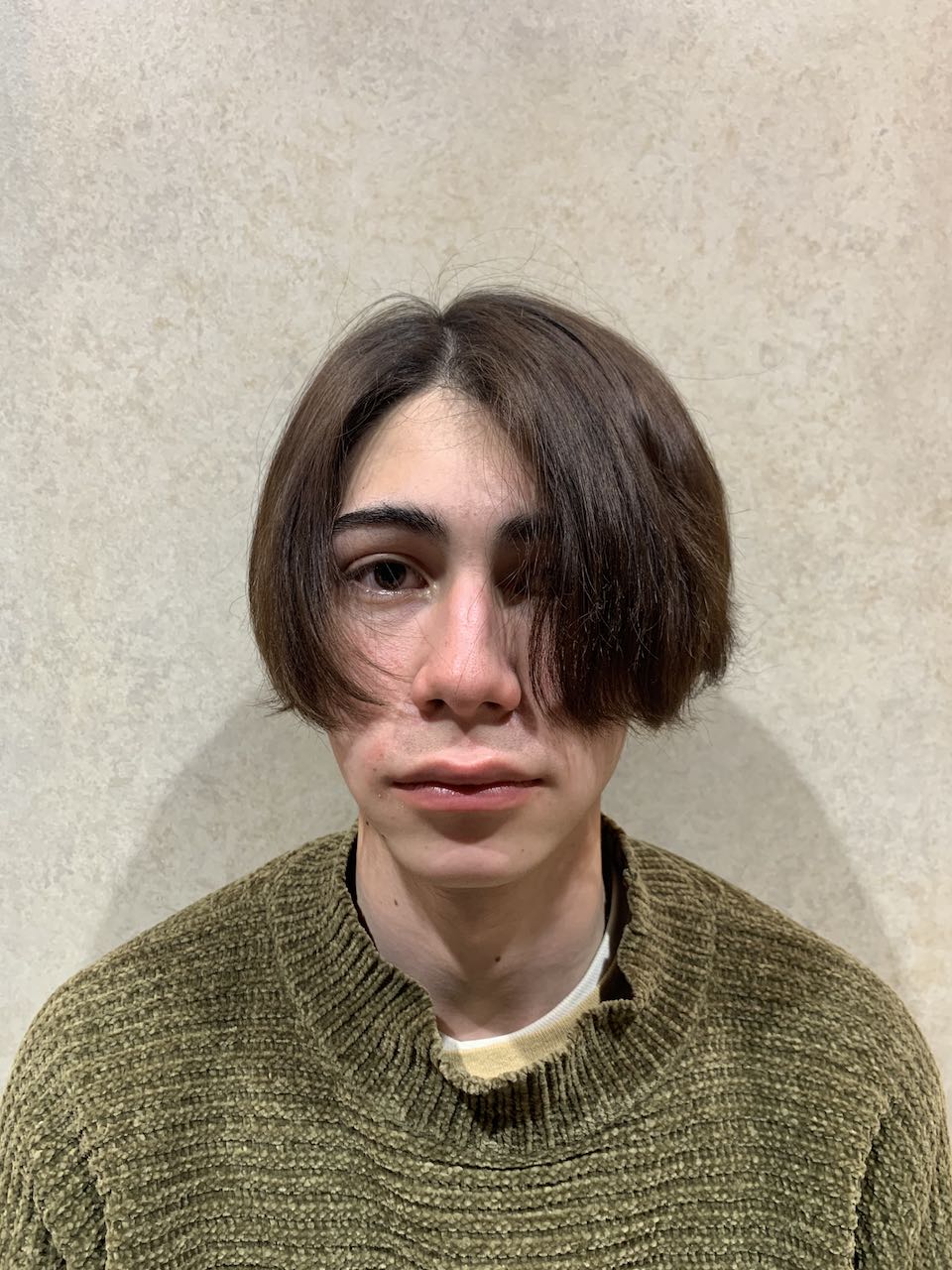 暗髪で重めのセンターパートスタイル。少し飽きていたところを今回はカラーで変身。立体感やボリューム感も確実に増す。