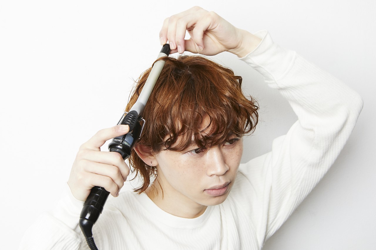 パーマを生かすようにフォームをもみ込んで自然乾燥(上)。さらに浮遊感を強調するよう、乾いたらバームワックスをなじませ、毛束を指でさくようにしてくずす(下)。全体のバランスを整えて完成。