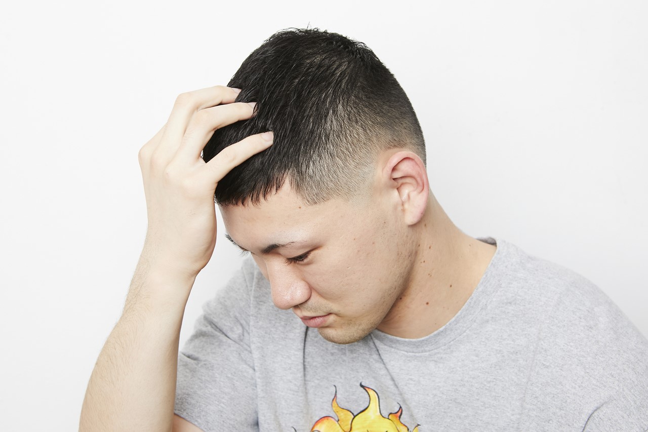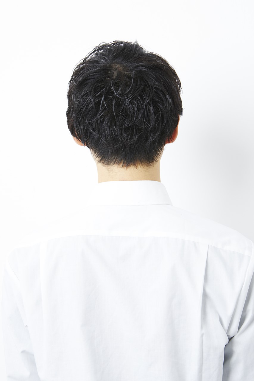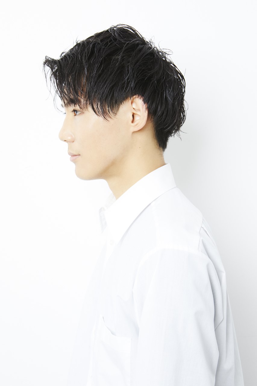 サラサラの直毛で動きが出にくい髪。印象も幼くなりがち。パーマで動きと男らしさを引き出したい。