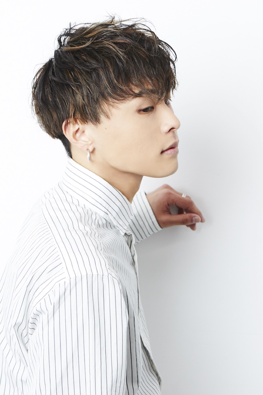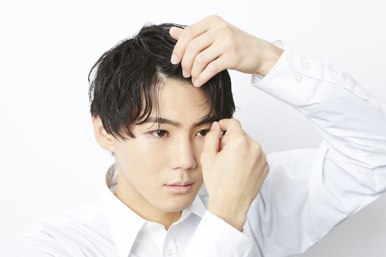 かき上げた前髪とトップの立ち上がり、表面の浮遊感でグッと大人っぽく爽やかに。適材適所でパーマを巻き分けるのがポイントだ。笑顔が映える好感ヘアの完成。