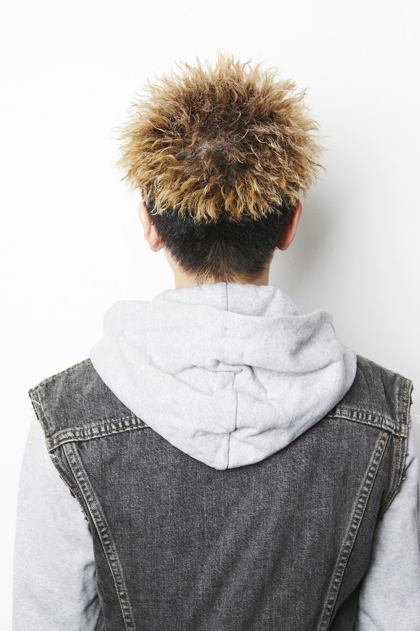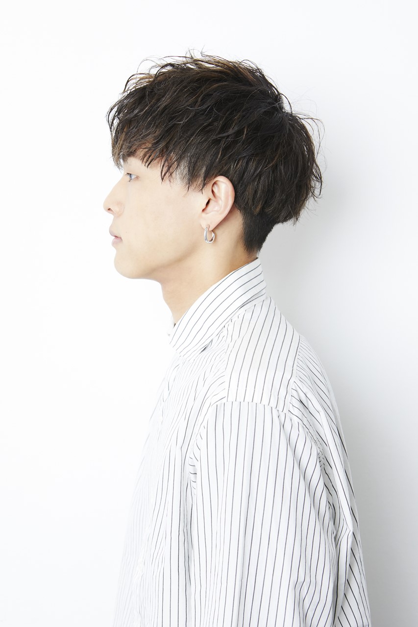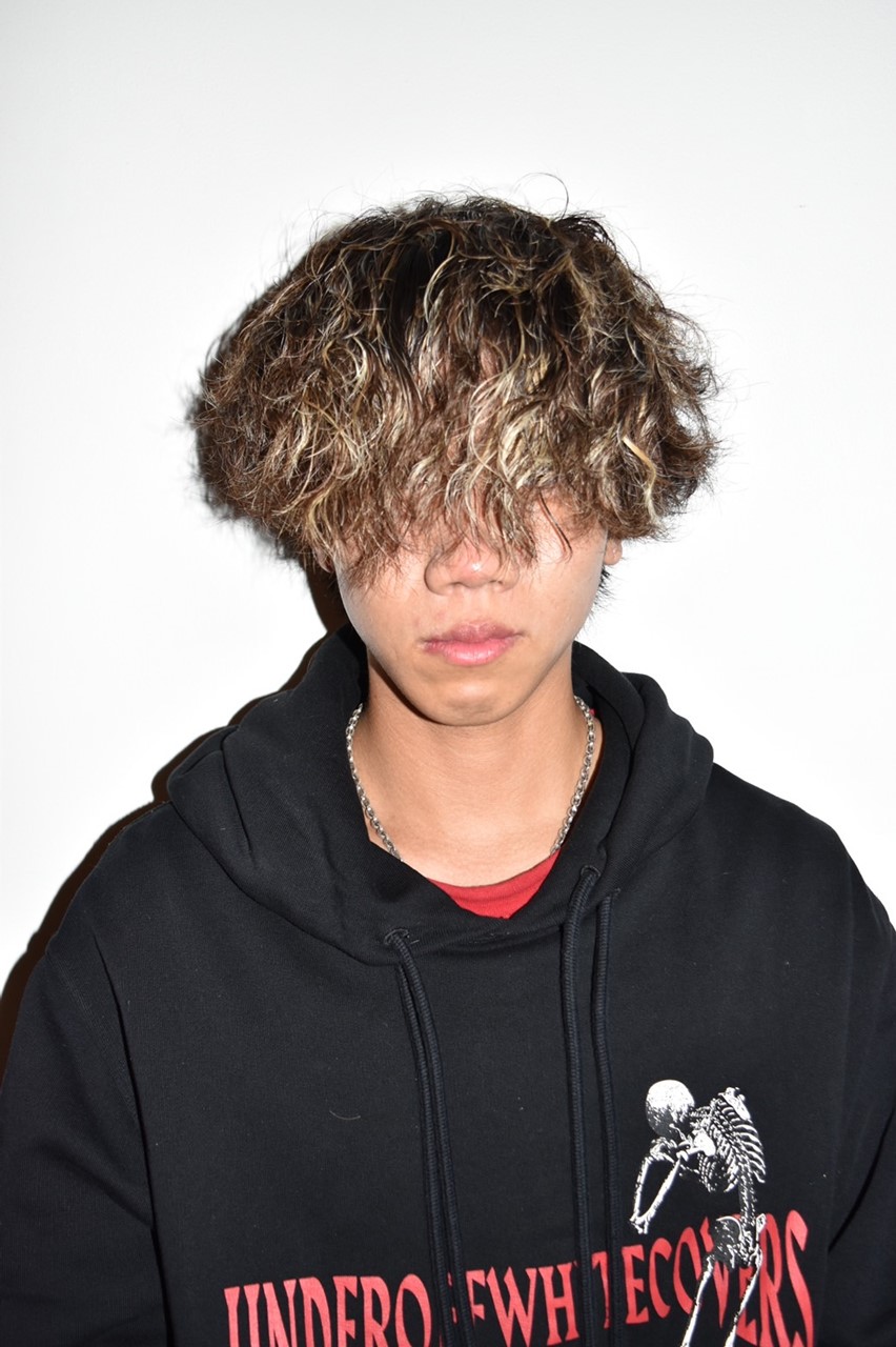 数カ月髪を切っていない状態。全体をコンパクトに整えながらパーマで遊びとストリート感を強調していく。