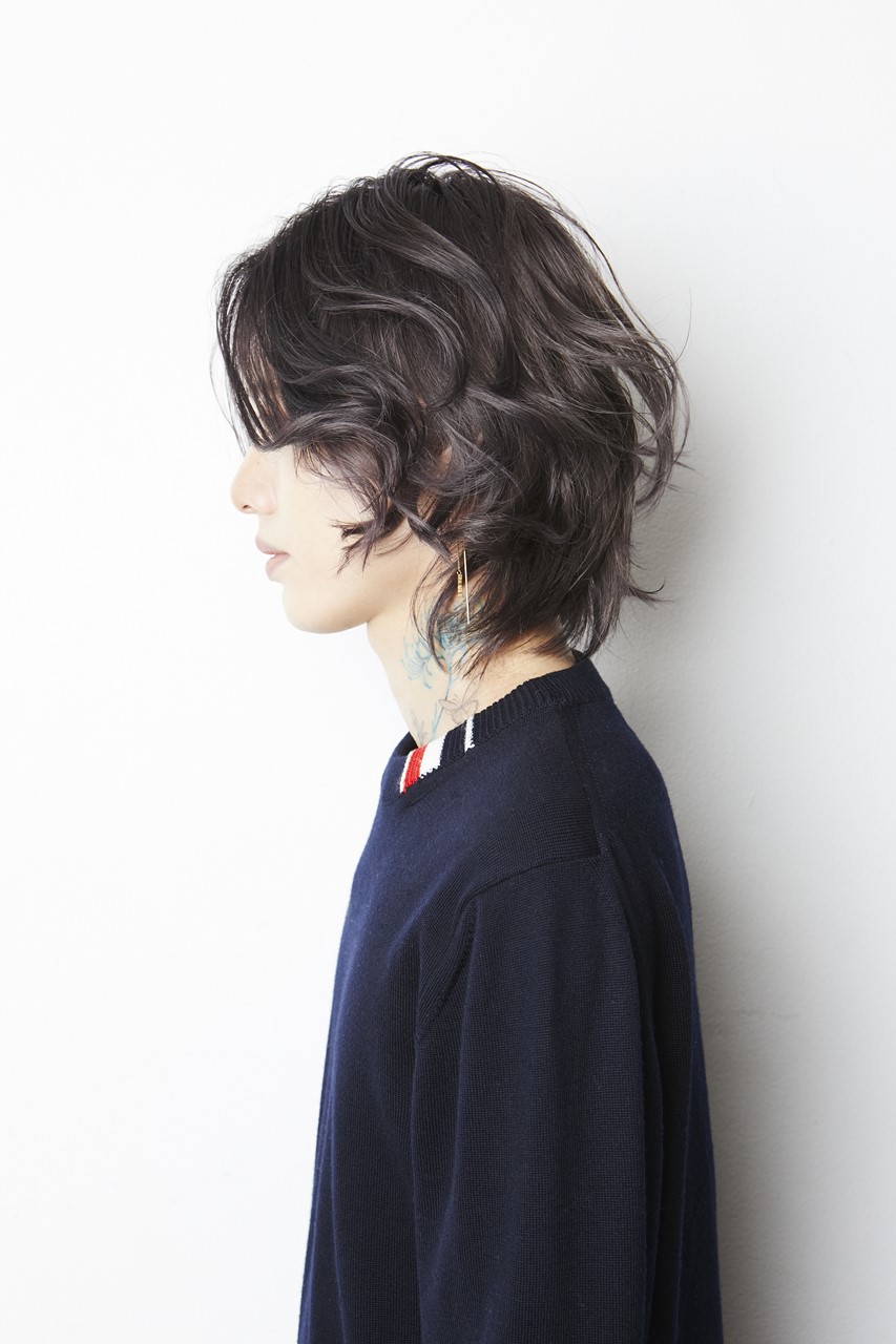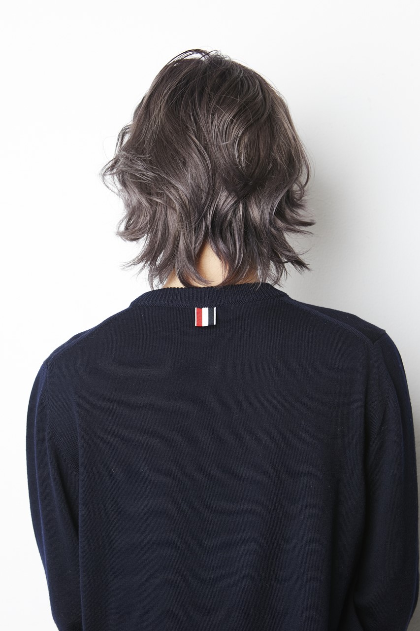グレー系カラーへのチェンジで髪をきれいに見せ、さらに清潔感もアップ。エアリーなショートレイヤーを生かすべく、ハイライトを投入し、ワンカール巻いて強調。