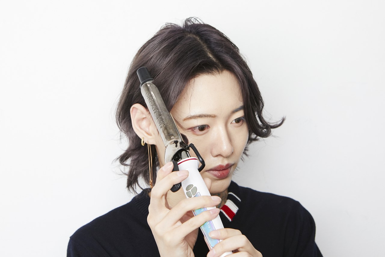 26mmのアイロンで前髪はリバースに巻いて外ハネに、えり足は内外をミックスして巻く。オイルでツヤを。