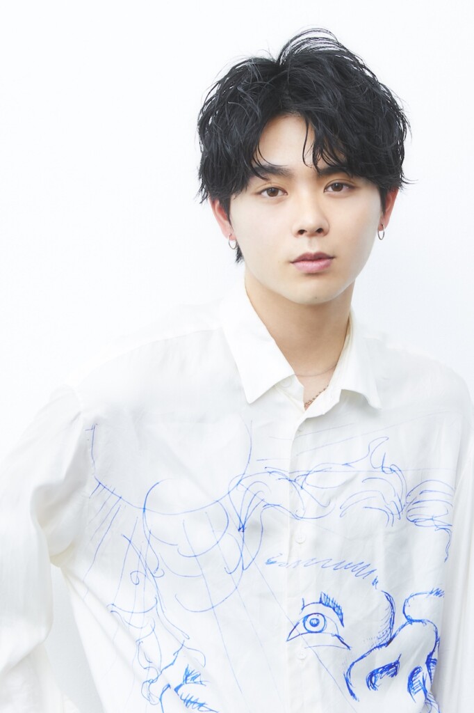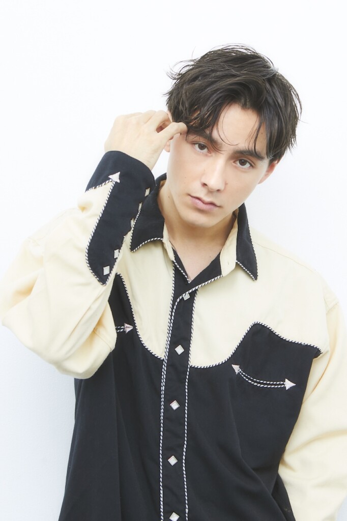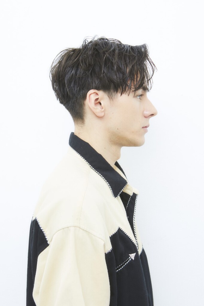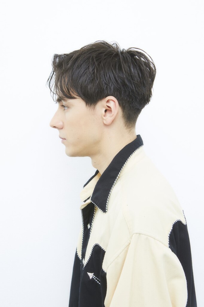立ち上げつつも揺れ落ちる。いわゆるアップバングの男らしさとは一線を画すムードあふれるパートヘア。目元に沿うように毛束を落とし、ニュアンシーな表情を引き立てたい。