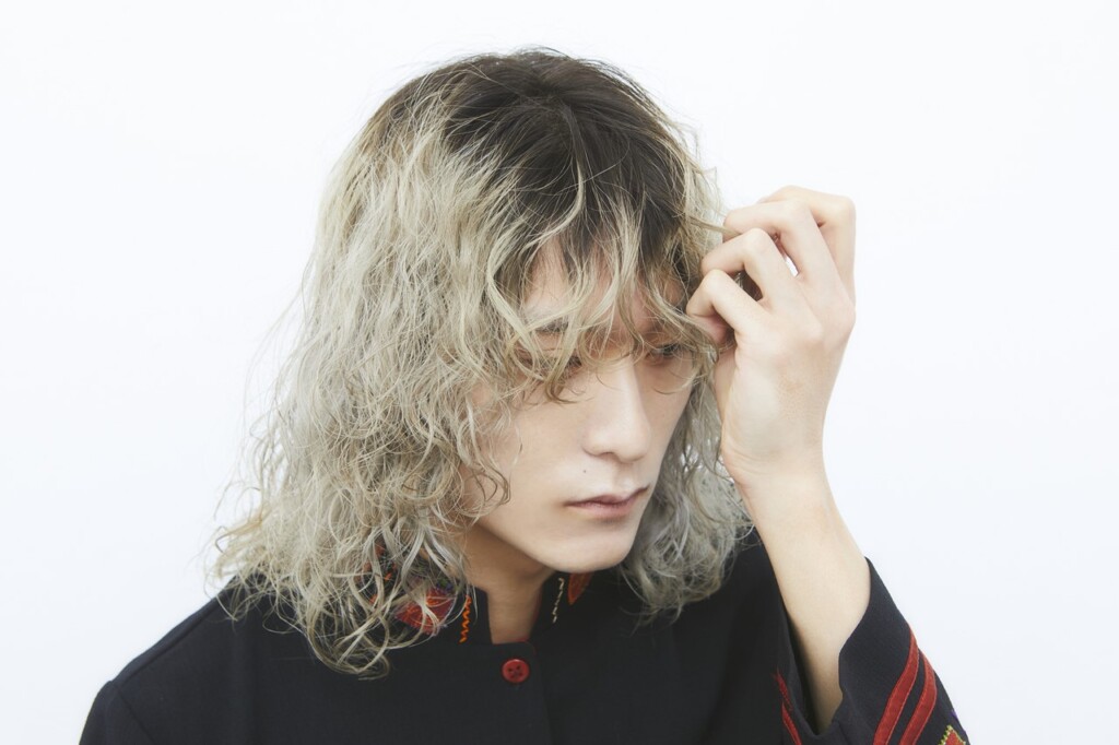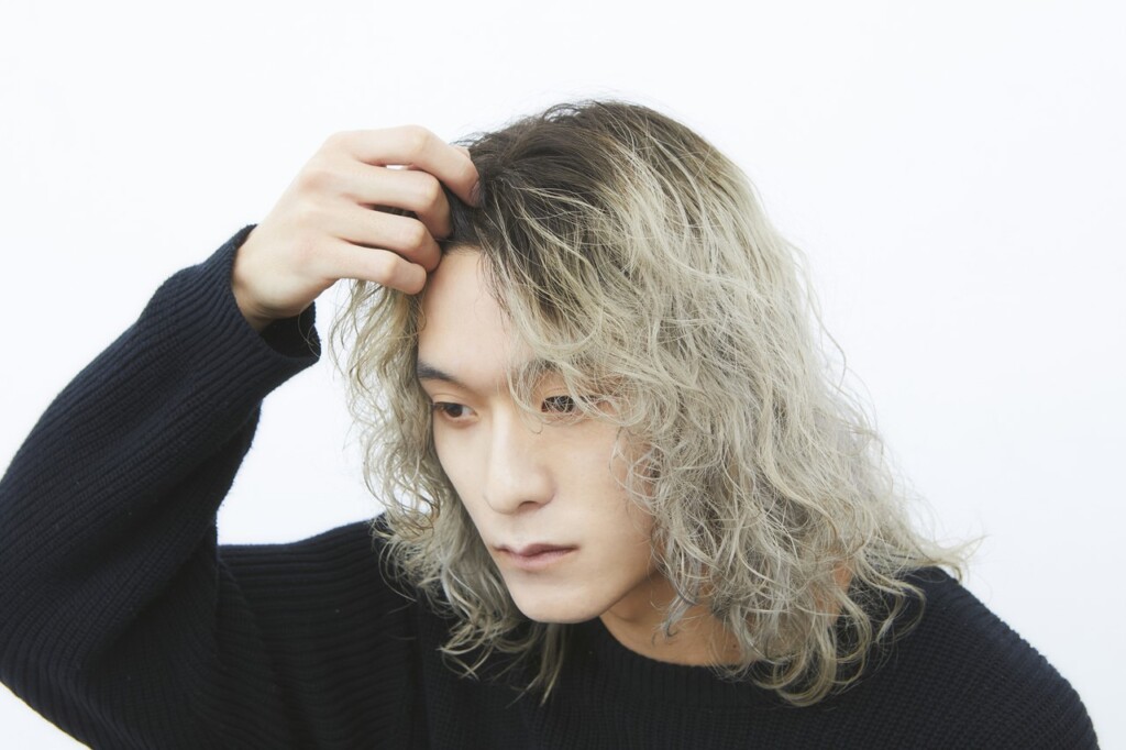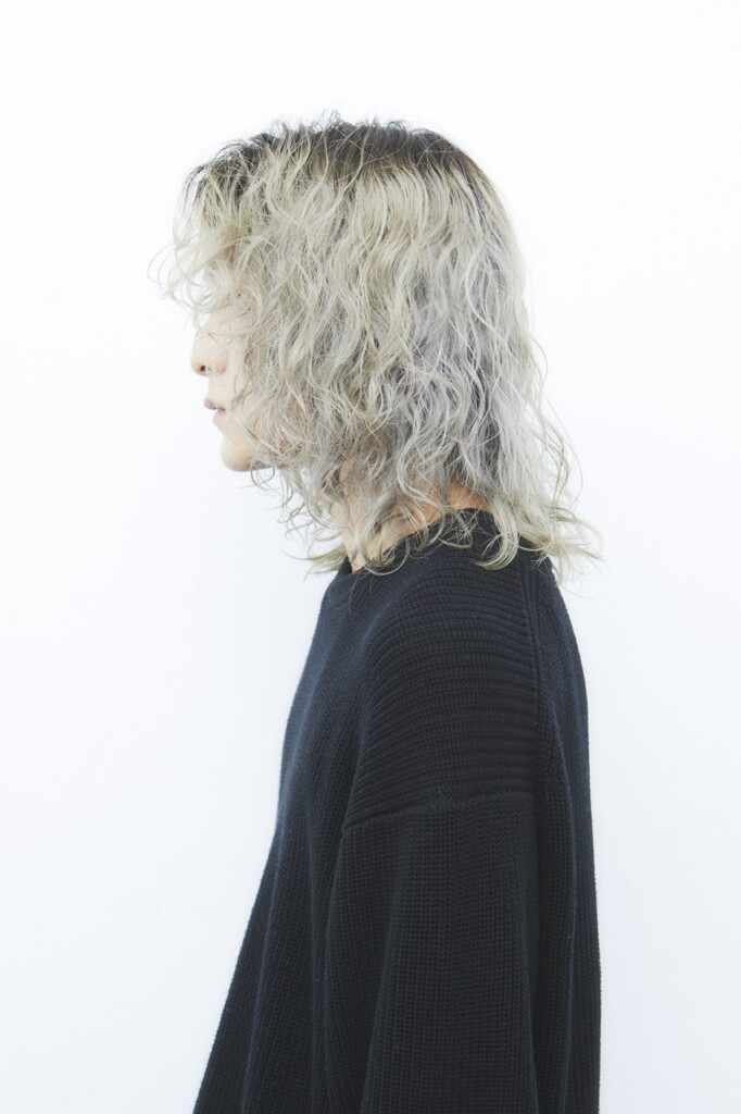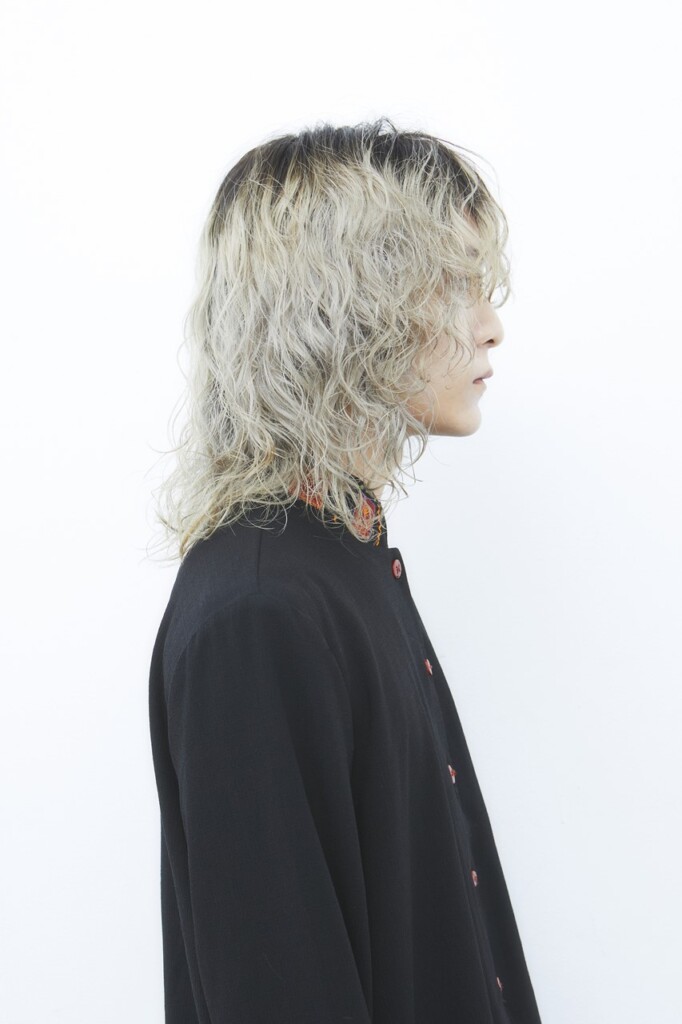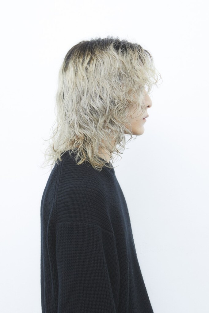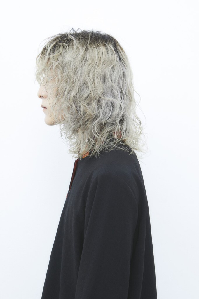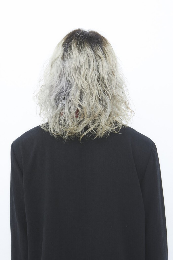 前髪を下ろすことによって堪能できるメリハリの効いたカラーと強めのウェーブ。トゥーマッチにはならないよう、スタイリング剤の質感にこだわりを。フォギーなタッチが正解。