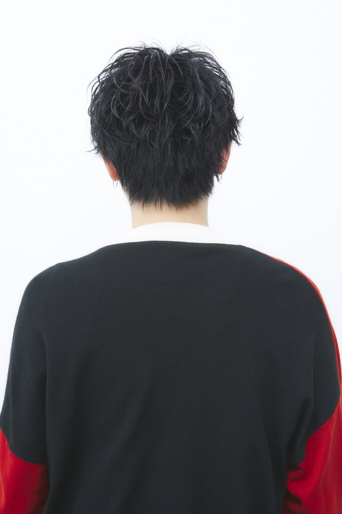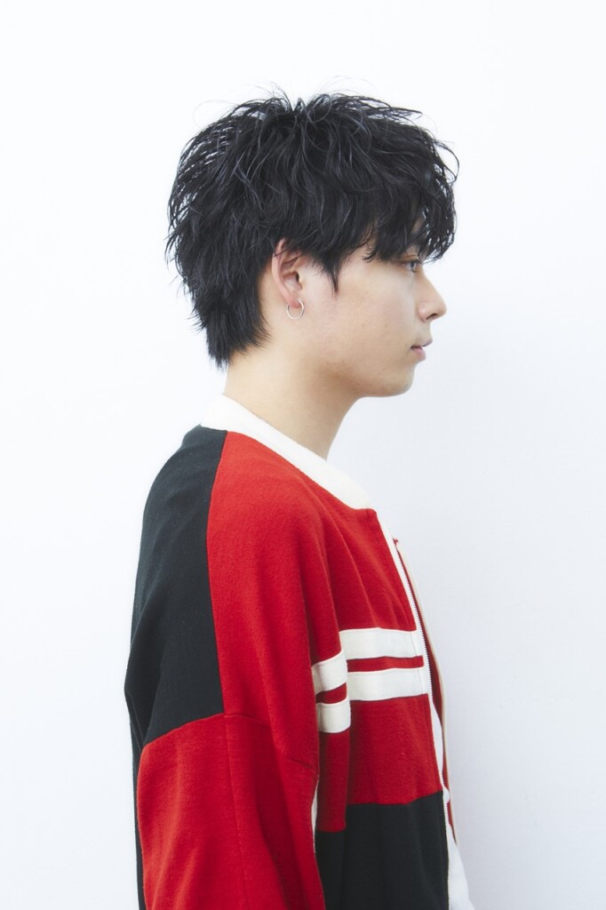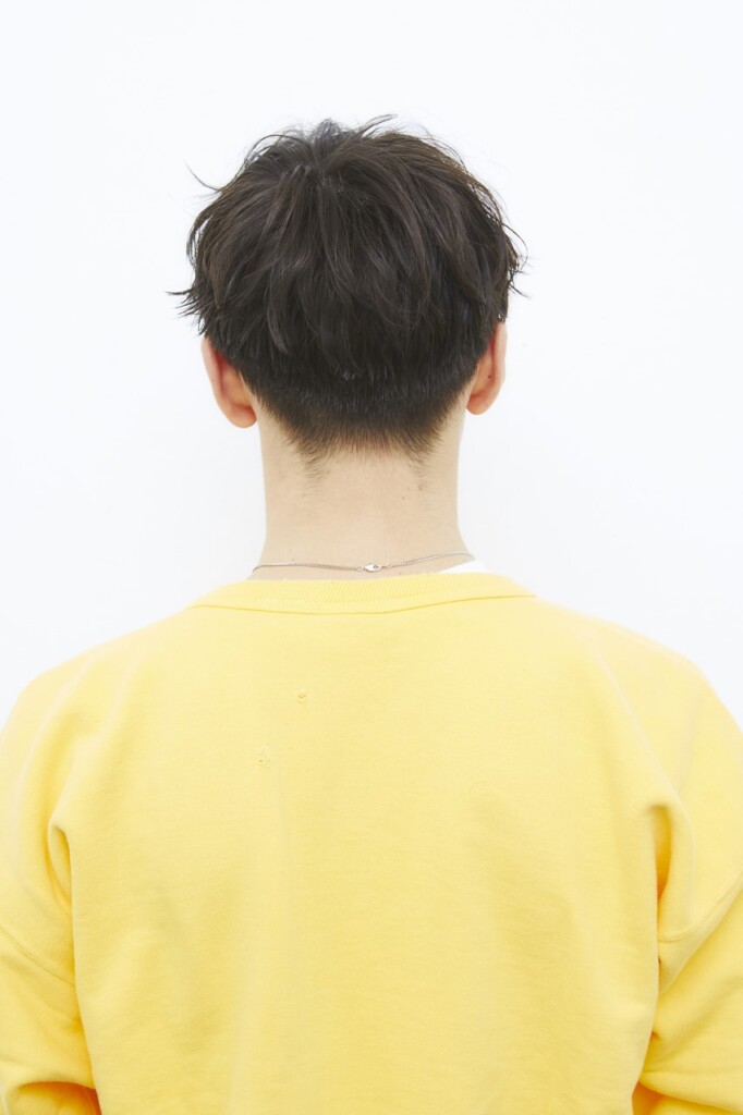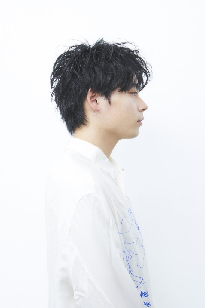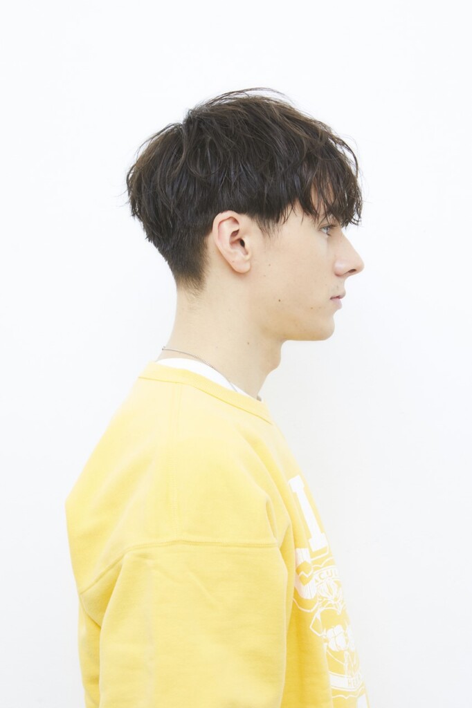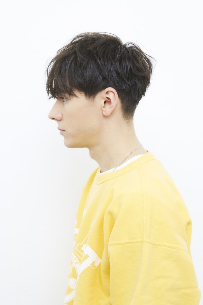 ウェットの状態でオイルを付けてドライ。目と目の間のみ立ち上げ、毛先は額にかかるように。つむじ~フロントはボリュームを出していこう。