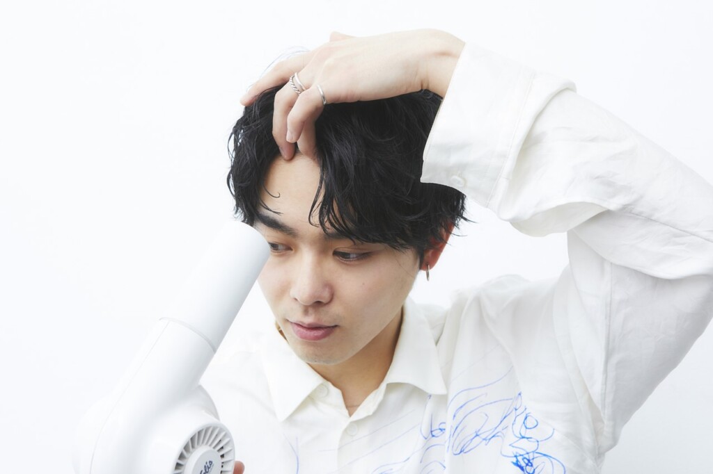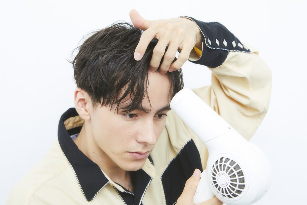 立ち上げる根元にドライヤーの風を送り込み、形づけを。ウェット系ワックスをまんべんなくなじませ、毛束を目元に散らして完成だ。