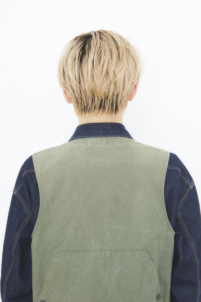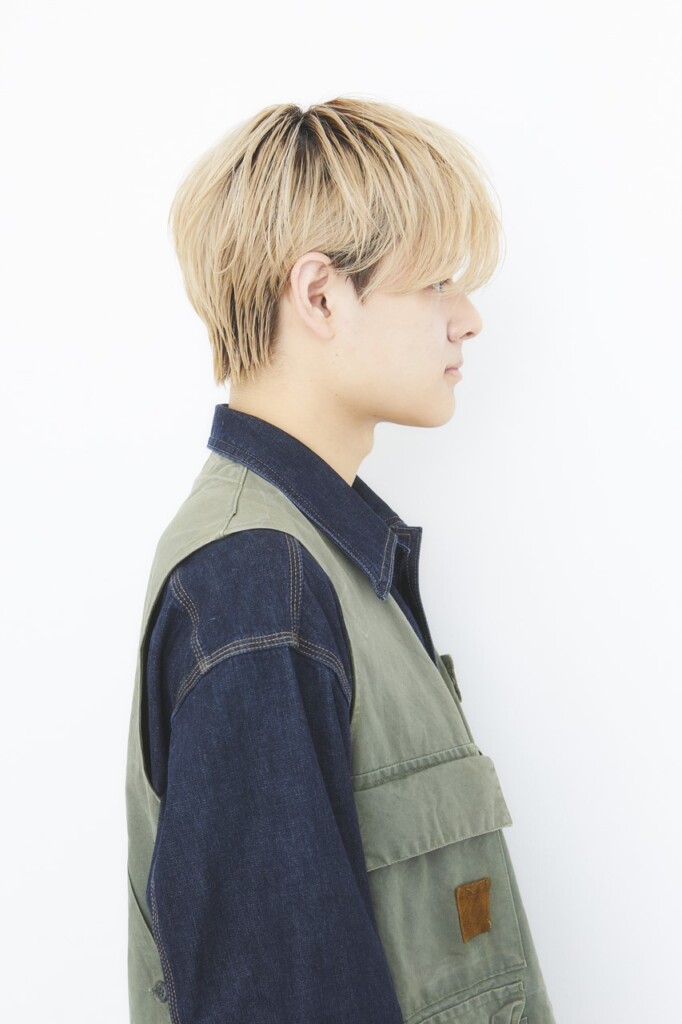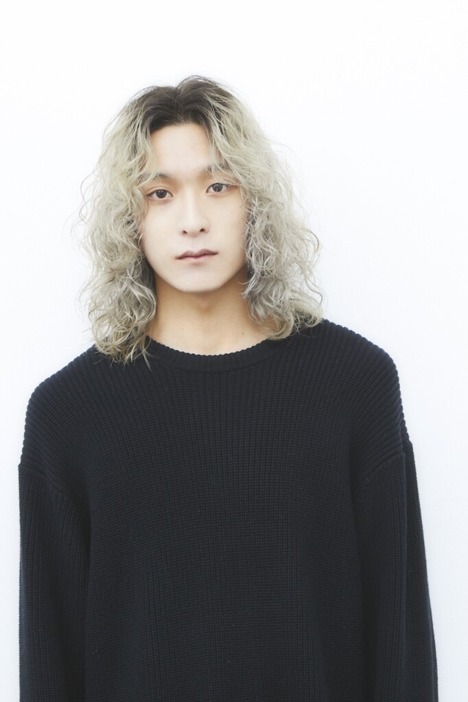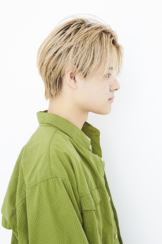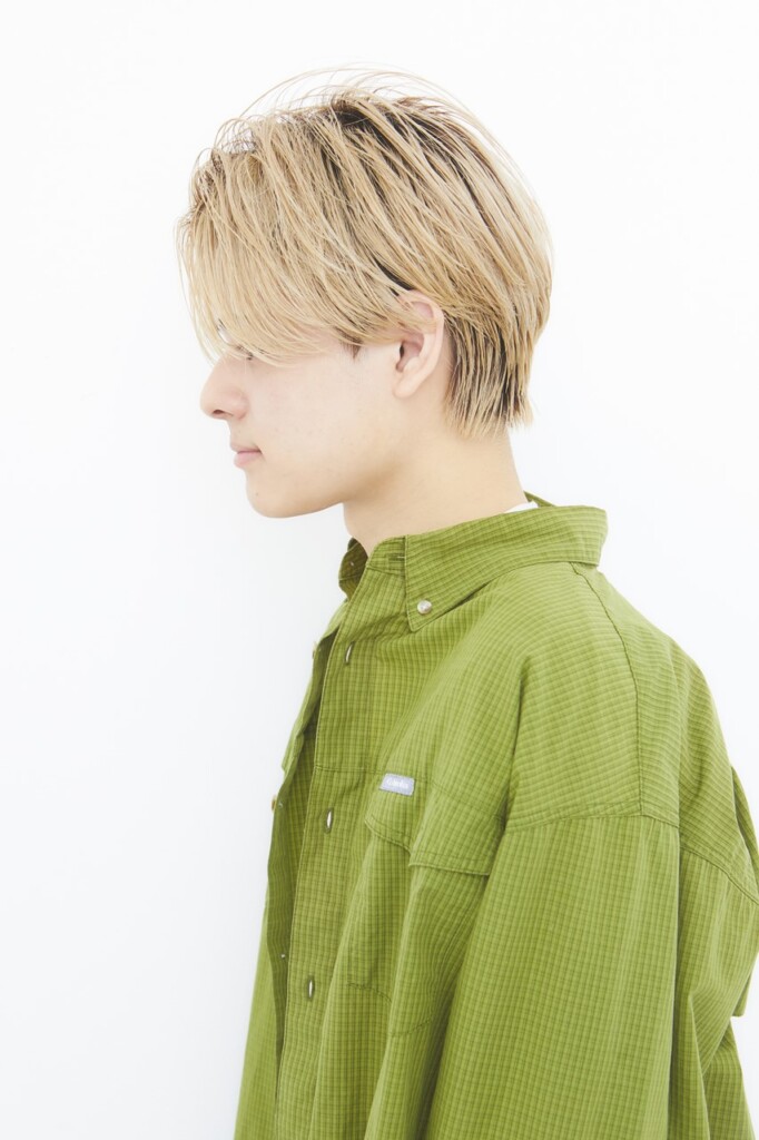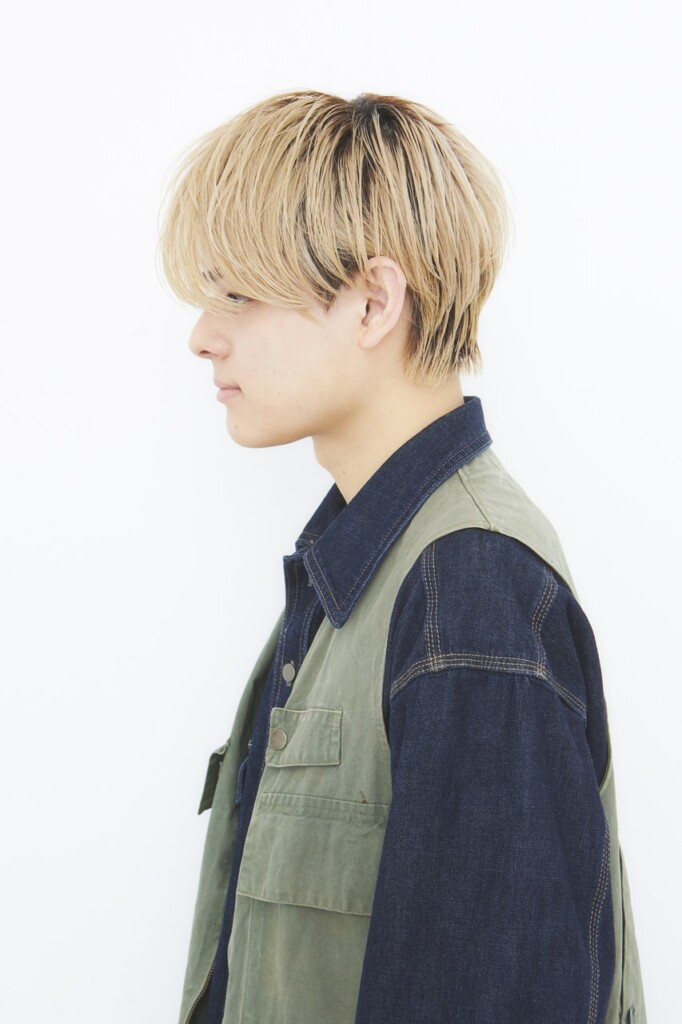 レディースのヘアのような趣もある、柔らかい印象のバングデザイン。ホワイトベージュカラーとの相乗効果でたっぷりの透け感を味わえる。次なるマッシュを探している人にも◎。